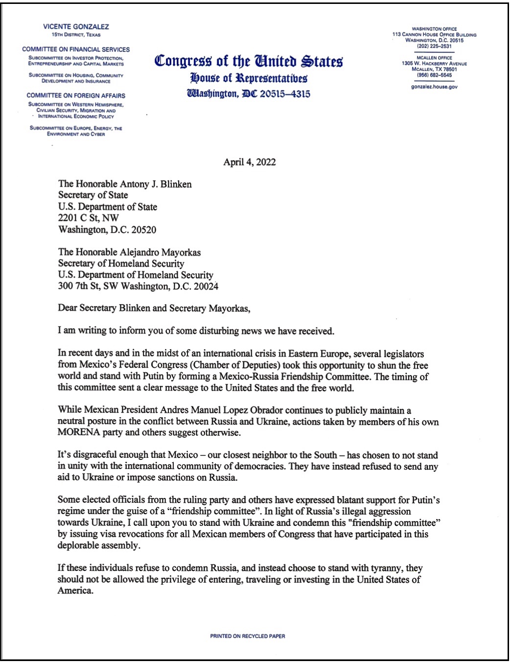 López Obrador se refirió a las petición del congresista demócrata Vicente González, quien mediante una carta dirigida a los secretarios de Estado, Antony Blinken, y de Seguridad Nacional, Alejandro Mayorkas, condenó el “apoyo flagrante” que legisladores mexicanos le dieron al Gobierno de Vladímir Putin.