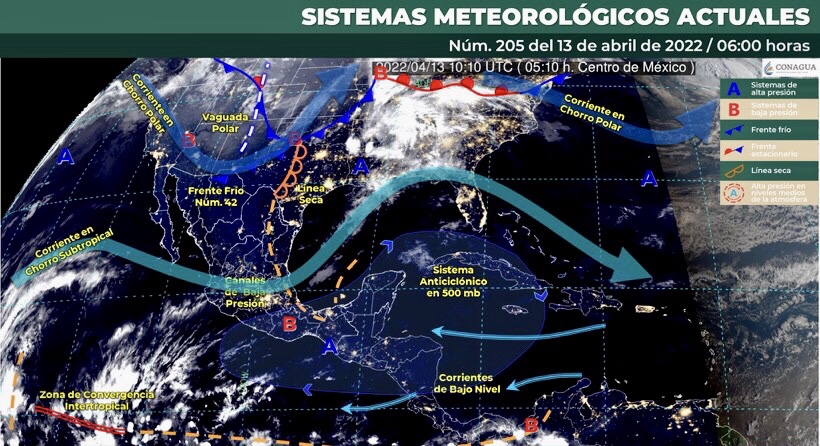 Este día, el frente frío Núm. 42 se extenderá sobre el norte de México e interaccionará con la corriente en chorro y con una línea seca sobre el noreste del país, generando rachas de viento fuertes a muy fuertes y tolvaneras sobre entidades de la Mesa del Norte. A su vez, un canal de baja presión sobre la vertiente del Golfo de México y el ingreso de humedad proveniente del Océano Pacífico y Mar Caribe, originarán lluvias puntuales fuertes en Oaxaca y Chiapas, así como lluvias y chubascos en zonas del oriente y sureste de la República Mexicana, incluida la Península de Yucatán, todas las lluvias con descargas eléctricas. Así mismo, se presentará viento de componente este sobre el noreste del país, el litoral del Golfo de México y la Península de Yucatán, además de ambiente vespertino cálido a caluroso sobre la mayor parte del territorio nacional (excepto en el norte y noroeste).