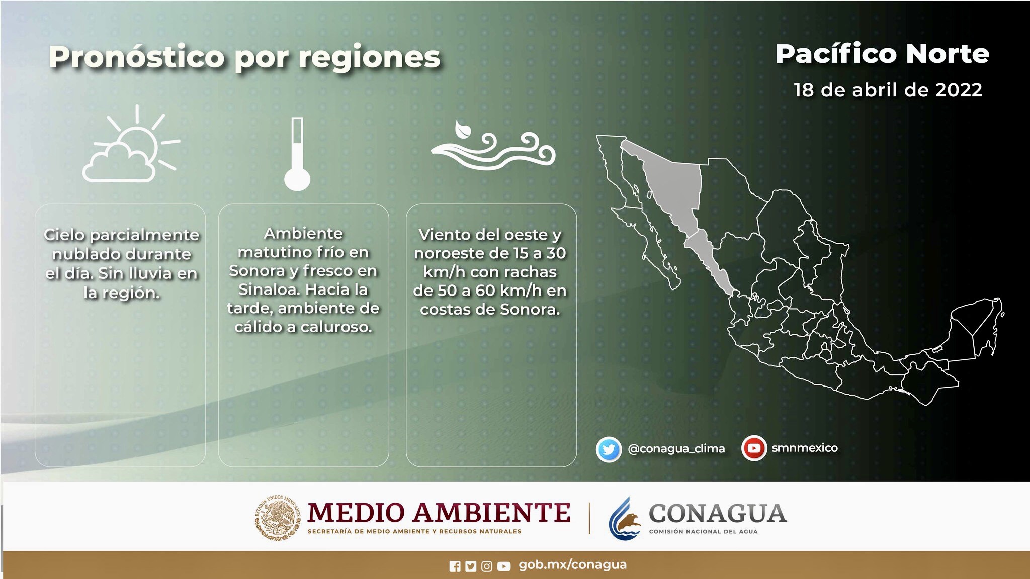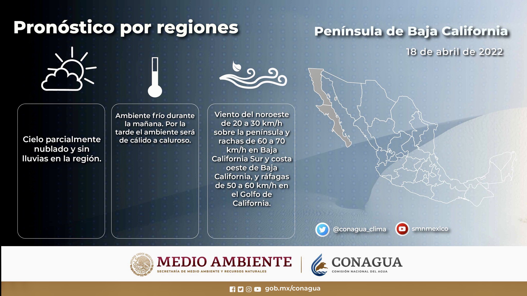¡Buen día! el #SMNmx te comparte en las siguientes #Infografías las condiciones #Meteorológicas que predominarán este lunes en la #PenínsulaDeBajaCalifornia y los estados del #Pacífico mexicano.