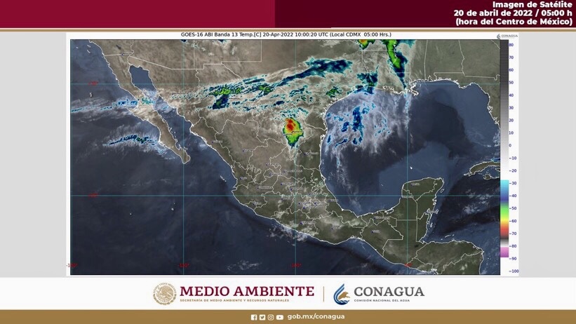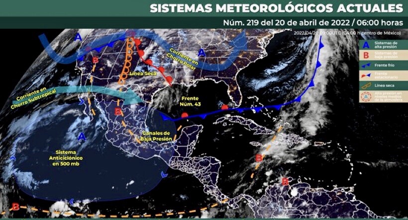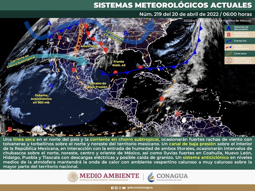 Para hoy, una línea seca sobre el norte del país y la corriente en chorro subtropical, ocasionarán fuertes rachas de viento con probabilidad de tolvaneras y torbellinos sobre el norte y noreste del territorio mexicano. Un canal de baja presión sobre el interior de la República Mexicana, en interacción con la entrada de humedad de ambos litorales, ocasionarán intervalos de chubascos sobre el norte, noreste, centro y oriente de México, así como lluvias puntuales fuertes en zonas de Coahuila, Nuevo León, Hidalgo, Puebla y Tlaxcala. Dichas lluvias se podrían acompañar de descargas eléctricas y posible caída de granizo. Finalmente, persistirá un sistema anticiclónico en niveles medios de la atmósfera manteniendo la onda de calor con ambiente vespertino caluroso a muy caluroso sobre la mayor parte del territorio nacional.