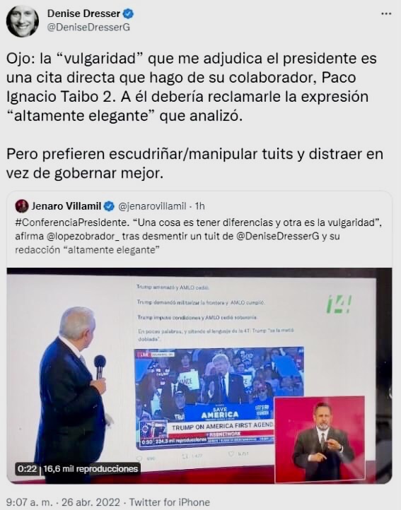 “Ojo: la ‘vulgaridad’ que me adjudica el presidente es una cita directa que hago de su colaborador, Paco Ignacio Taibo 2. A él debería reclamarle la expresión ‘altamente elegante’ que analizó.Pero prefieren escudriñar/manipular tuits y distraer en vez de gobernar mejor”, escribió Denise Dresser en redes sociales.