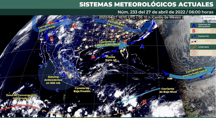 Este día, el frente Núm. 45 se extenderá en el norte del Golfo de México y dejará de afectar el territorio nacional. Por otra parte, un canal de baja presión sobre el norte y centro del país, en interacción con inestabilidad en niveles altos de la atmósfera y la entrada de humedad de ambos océanos, ocasionarán chubascos y lluvias puntuales fuertes en dichas regiones, ráfagas de viento en el norte de la República Mexicana, además de condiciones para la formación de torbellinos en zonas de Coahuila, Nuevo León y Tamaulipas. Un segundo canal de baja presión en el sureste del país asociado con la entrada de humedad del Golfo de México y Mar Caribe, generarán chubascos y lluvias fuertes en la región mencionada, además de la Península de Yucatán. Todas las lluvias estarán acompañadas de descargas eléctricas y posible caída de granizo. También, persistirá ambiente caluroso a muy caluroso sobre el noroeste, occidente, sur y sureste del territorio mexicano, incluida la Península de Yucatán.