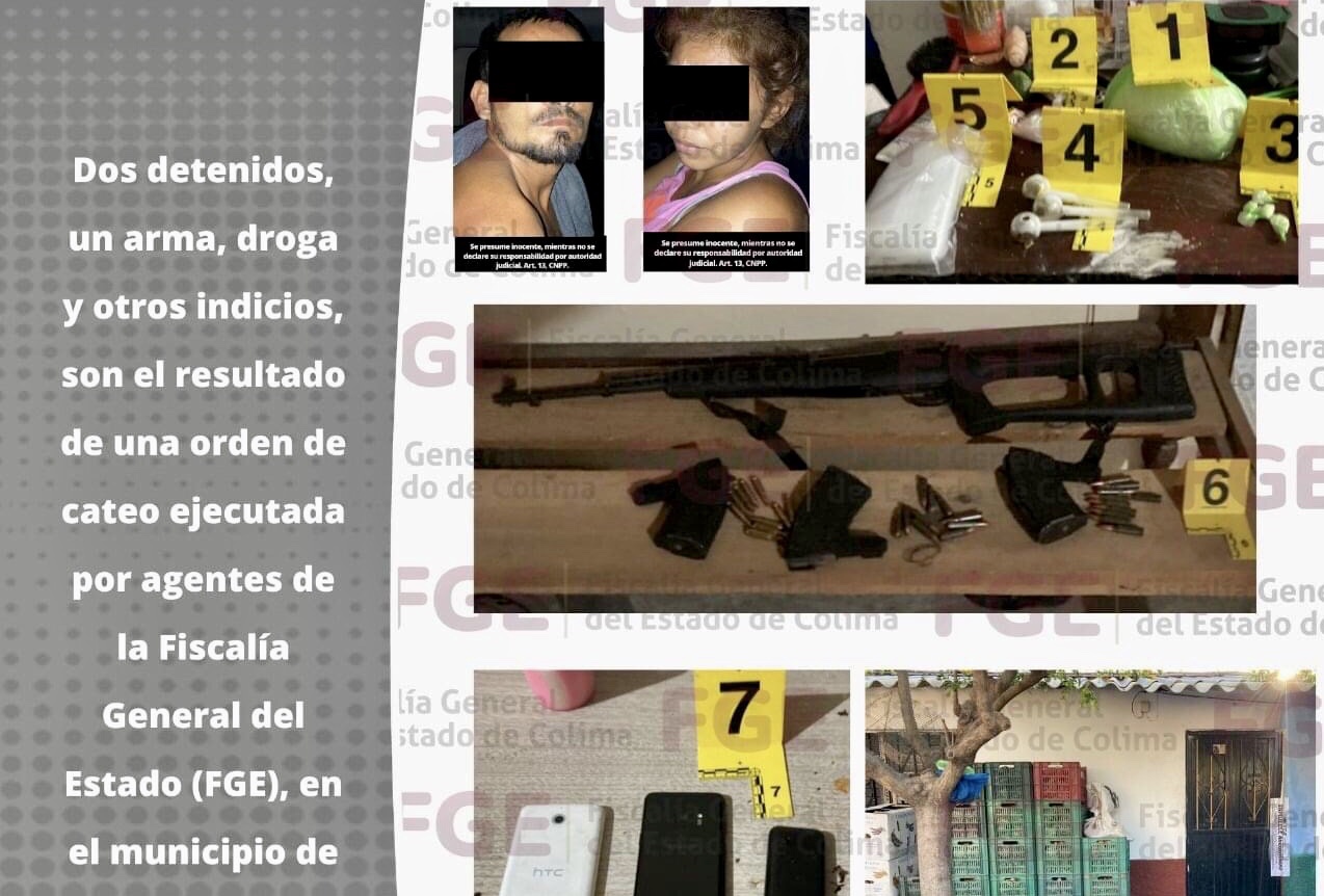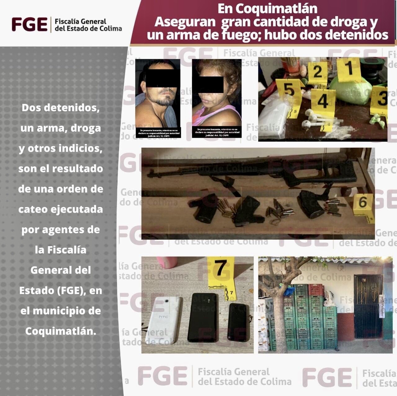 Dos detenidos, un arma, droga y otros indicios, son el resultado de una orden de cateo ejecutada por agentes de la Fiscalía General del Estado (FGE), en el municipio de Coquimatlán.