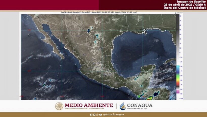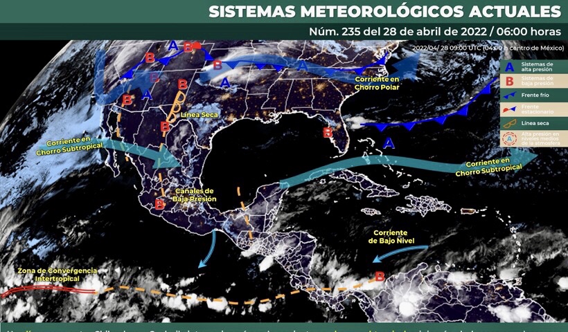 Para hoy, una línea seca se establecerá entre Chihuahua y Coahuila e interaccionará con la corriente en chorro subtropical, manteniendo condiciones para chubascos acompañados de descargas eléctricas en el norte de México, además de vientos fuertes con rachas de 60 a 70 km/h y posibles tolvaneras en Baja California, Sonora, Chihuahua, Coahuila y Nuevo León. Por la tarde, canales de baja presión aunados a la entrada de aire cálido y húmedo proveniente de ambos océanos, producirán chubascos con descargas eléctricas, viento y posible caída de granizo sobre el centro y sureste mexicano, norte y occidente de la Península de Yucatán, con lluvias puntuales fuertes en Chiapas y Quintana Roo. Finalmente, prevalecerá el ambiente vespertino cálido a caluroso sobre gran parte de México, con temperaturas máximas muy calurosas (superiores a los 40°C) en regiones de Chihuahua, Sinaloa, Nayarit, Jalisco, Michoacán, Guerrero y Morelos.