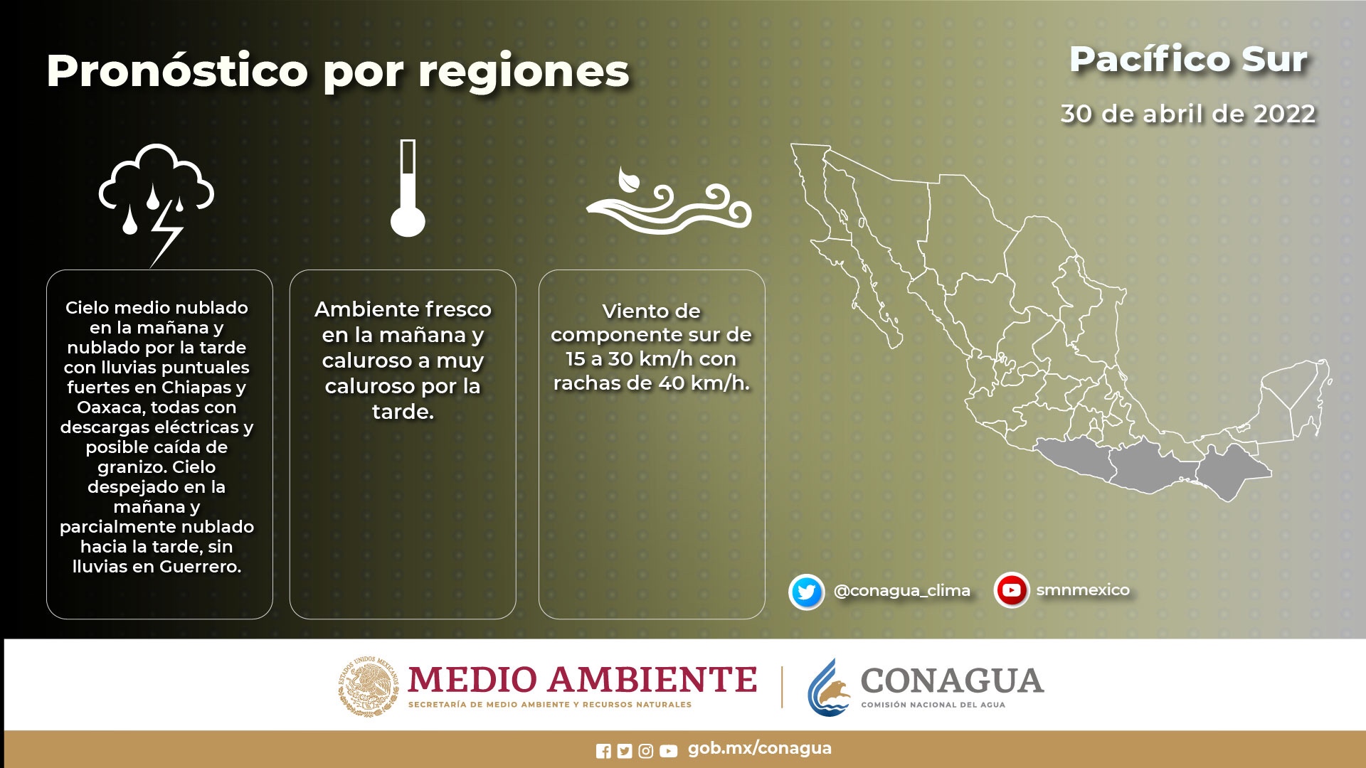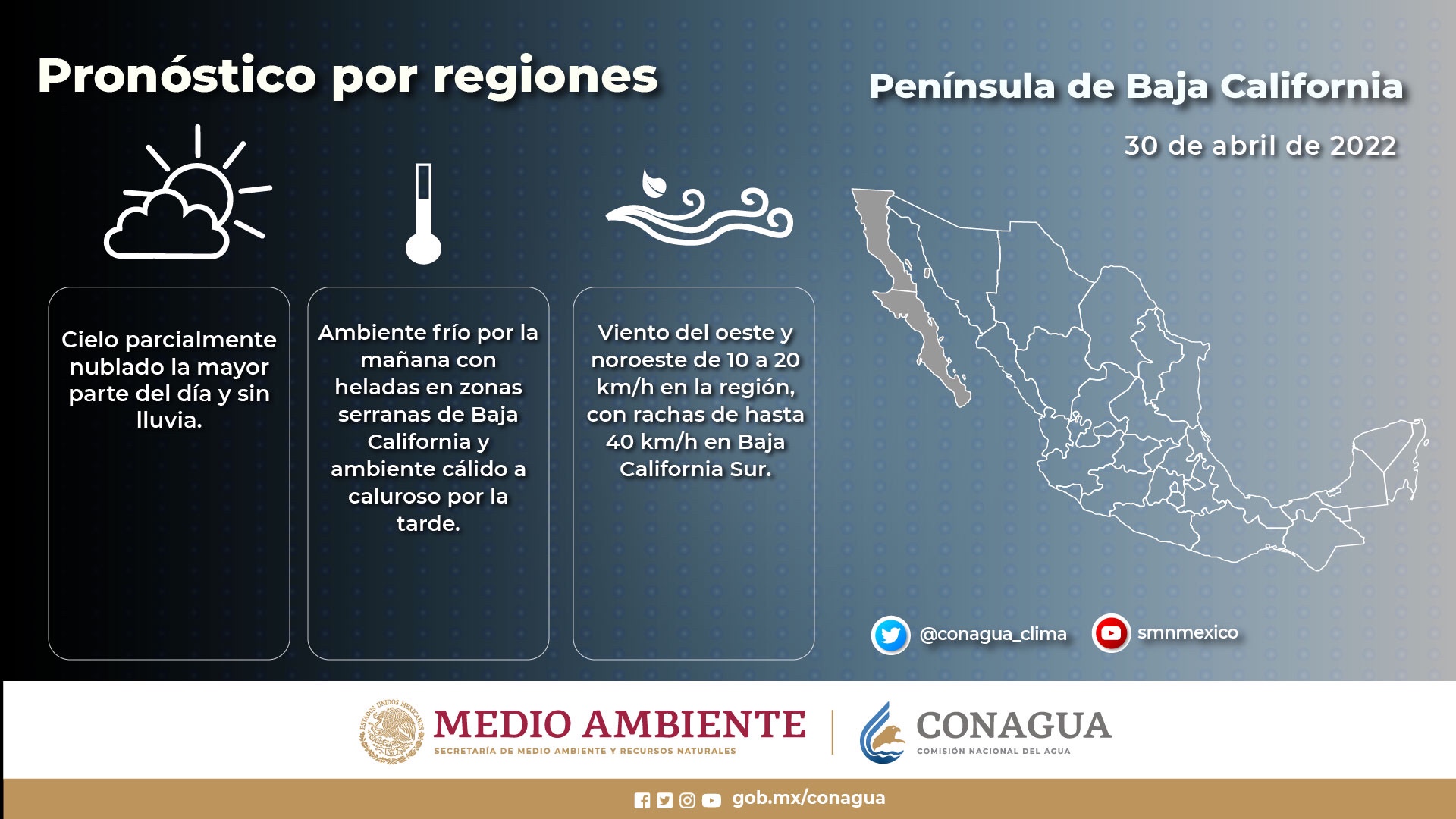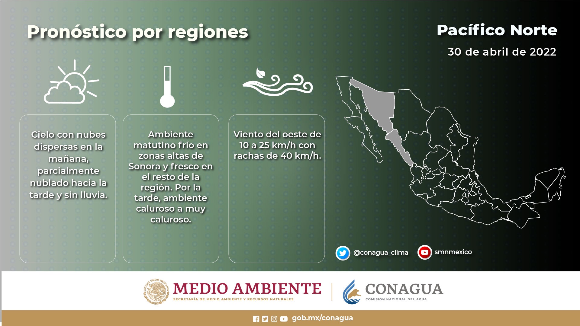 Condiciones del tiempo hoy en el Pacífico norte, centro sur, y la Península de Baja California.