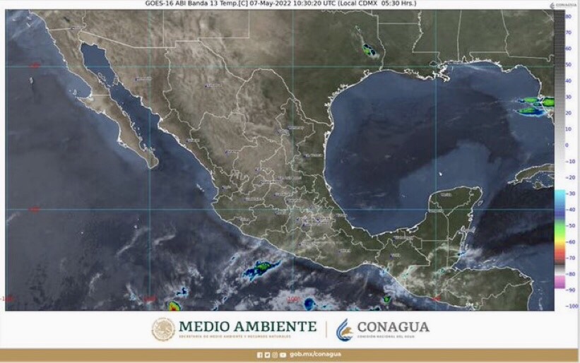 Golfo de México: Cielo parcialmente nublado por la mañana y nublado por la tarde con lluvias aisladas en Tamaulipas, Veracruz y Tabasco. Ambiente templado por la mañana y muy caluroso por la tarde. Viento del este y sureste de 10 a 25 km/h en la región con rachas de 60 a 80 km/h y probabilidad de tolvaneras en Tamaulipas, además de rachas de hasta 50 km/h en costas de Veracruz.