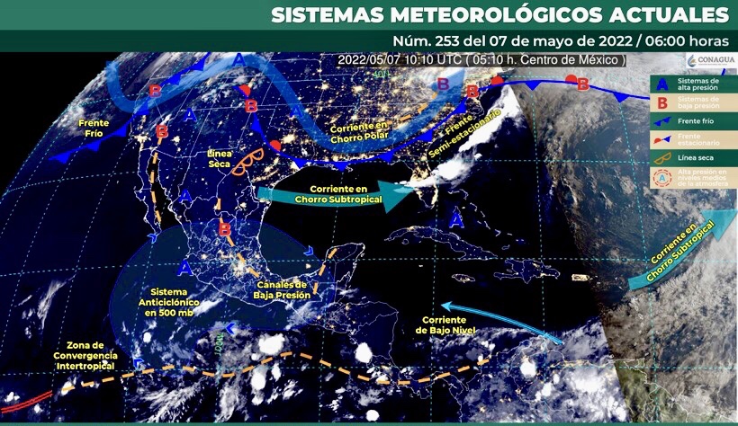 Este día, un nuevo frente frío de corta duración, asociado con una vaguada polar, se aproximará e ingresará sobre el noroeste de México, originando vientos con rachas de 60 a 80 km/h y tolvaneras en Baja California, Sonora y Chihuahua. Una línea seca permanecerá sobre Coahuila e interaccionará con un canal de baja presión que se extenderá desde el noreste hasta el centro del país, ambos sistemas asociados al ingreso de humedad proveniente del Océano Pacifico y Golfo de México, producirán lluvias fuertes en Hidalgo, Querétaro, Puebla y Tlaxcala, así como vientos con rachas de 60 a 80 km/h y tolvaneras en estados de la Mesa del Norte. Un segundo canal de baja presión en el sureste de la República Mexicana, generará lluvias puntuales muy fuertes en Chiapas. Las lluvias mencionadas estarán acompañadas de descargas eléctricas, rachas de viento y caída de granizo. Adicionalmente, un sistema anticiclónico en niveles medios de la atmósfera mantendrá la onda de calor sobre gran parte del territorio mexicano con temperaturas por arriba de los 40°C en 20 estados de la República Mexicana.