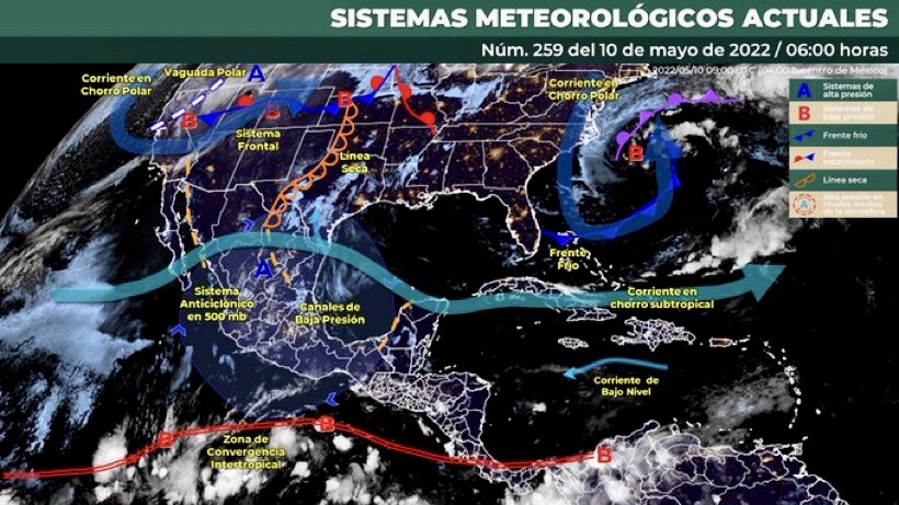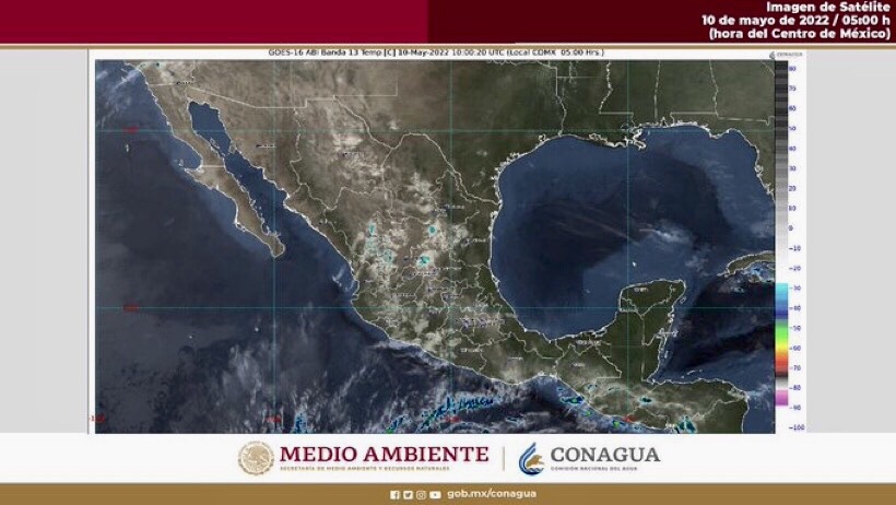 Para hoy, una línea seca persistirá sobre Coahuila y en interacción con el ingreso de aire cálido y húmedo del Golfo de México, propiciarán lluvias puntuales muy fuertes en Coahuila, acompañadas de descargas eléctricas, caída de granizo, rachas de viento muy fuertes (de 70 a 80 km/h) y posible formación de torbellinos o tornados en Coahuila y el noreste de Chihuahua, así como rachas de viento fuertes (de 60 a 70 km/h) con posible formación de torbellinos o tornados en el noroeste de Tamaulipas y el norte de Nuevo León. Por su parte, un frente frío débil se aproximará al norte de Baja California y en combinación con la corriente en chorro polar, generará descenso de temperatura y rachas de viento fuertes en el noroeste de México. A su vez, el ingreso de humedad del Océano Pacífico, Golfo de México y Mar Caribe, y canales de baja presión sobre la Mesa del Norte y el sureste de México, en combinación con inestabilidad en la atmósfera superior, originarán lluvias puntuales muy fuertes en Chiapas, chubascos y lluvias puntuales fuertes acompañadas de descargas eléctricas y posibles granizadas en el norte, noreste, occidente, oriente, centro y sureste de la República Mexicana, así como lluvias aisladas en la Mesa Central, incluido el Valle de México. Por último, un sistema anticiclónico en niveles medios de la atmósfera mantendrá la onda de calor sobre el territorio nacional, con temperaturas máximas superiores a 40 °C en zonas de Sonora, Sinaloa, Nayarit, Jalisco, Michoacán, Morelos, Guerrero, Oaxaca, Veracruz, Tabasco, Campeche y Yucatán.