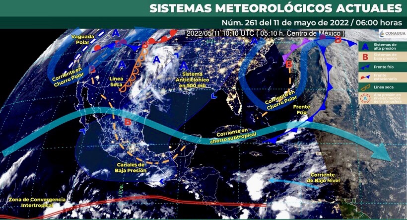 Este día, una línea seca sobre el norte de México, interactuará con inestabilidad en la atmósfera superior, un canal de baja presión sobre la Mesa del Norte y la corriente en chorro subtropical, propiciando rachas de viento fuertes y tolvaneras en el noroeste, norte y noreste de México, así como posible formación de torbellinos en Chihuahua (noreste) y Coahuila (norte), además de chubascos y lluvias puntuales fuertes, descargas eléctricas y caída de granizo en zonas del norte y noreste de la República Mexicana. Un canal de baja presión extendido sobre el oriente y sureste del territorio nacional, además del ingreso de humedad del Océano Pacífico y Golfo de México, ocasionarán chubascos y lluvias puntuales fuertes y descargas eléctricas en dichas regiones, además de la Península de Yucatán, occidente y centro del país. Se pronostica descenso de los valores máximos de temperatura en entidades del norte, noreste, oriente y sureste mexicano, sin embargo, se mantendrán valores superiores a los 35°C sobre dichas regiones.
