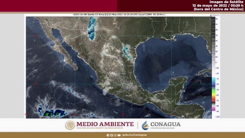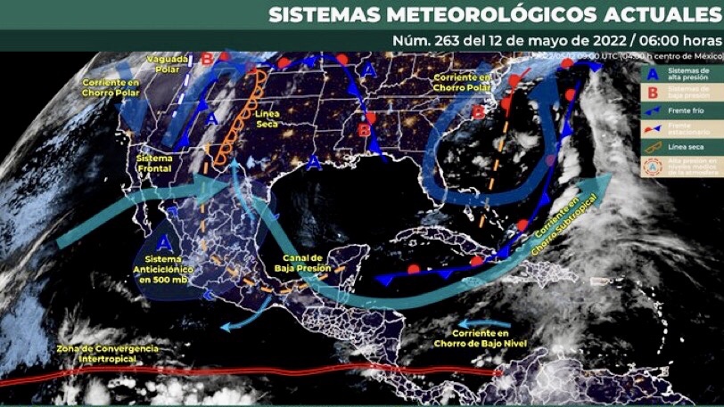 Para hoy, el desplazamiento de un sistema frontal sobre el sur de Estados Unidos en interacción con una línea seca en el norte de México y con la corriente en chorro subtropical, ocasionarán lluvias y chubascos, descargas eléctricas y posible caída de granizo en Chihuahua y Coahuila, además de rachas de viento de 60 a 70 km/h en Baja California, con posible desarrollo de torbellinos o tornados en el norte de Chihuahua y Coahuila. Canales de baja presión sobre la Mesa del Norte y Mesa Central, así como en el sureste del territorio nacional, en combinación con el ingreso de humedad de ambos océanos, generarán chubascos vespertinos acompañados de descargas eléctricas en Durango, Guerrero, Oaxaca, Veracruz y Tabasco, con lluvias puntuales fuertes en Chiapas. Finalmente, un sistema anticiclónico en niveles medios de la atmósfera mantendrá ambiente diurno cálido a caluroso sobre gran parte del país, con temperaturas máximas muy calurosas, (superiores a 40°C), en regiones de Sonora, Sinaloa, Chihuahua, Nayarit, Jalisco, Michoacán, Morelos y Guerrero.