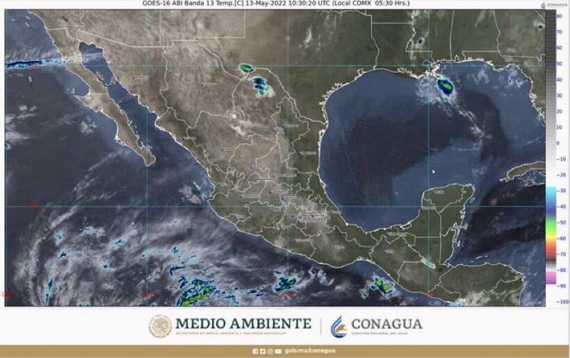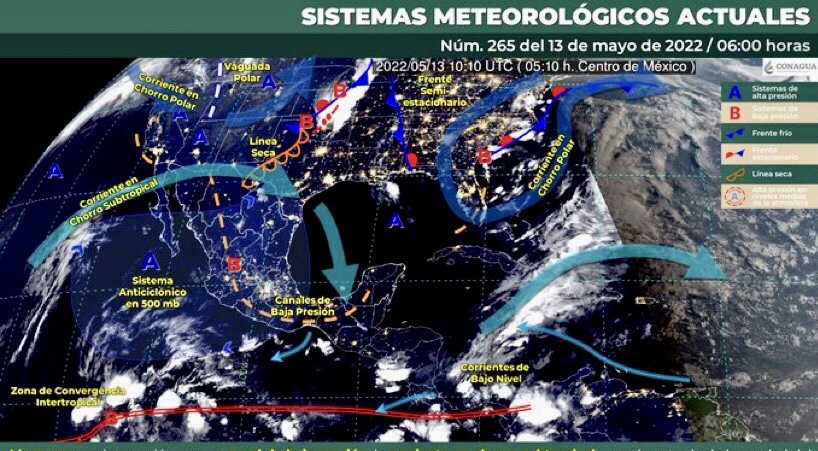 Este día, una línea seca persistirá en el norte del país y mantendrá interacción con un canal de baja presión que se extenderá sobre el interior de la República mexicana, con la corriente en chorro subtropical y con la entrada de humedad del Golfo de México, generando chubascos y lluvias puntuales fuertes con ráfagas de viento en el norte y noreste del territorio nacional, probabilidad de torbellinos y/o tornados en zonas de Coahuila, además de lluvias aisladas en el occidente y oriente del país. Un segundo canal de baja presión en el sureste de México, asociado con la entrada de humedad del Océano Pacífico y Mar Caribe, originarán lluvias puntuales fuertes en Chiapas y chubascos en Oaxaca. Por otra parte, un sistema anticiclónico en niveles medios y altos de la atmósfera sobre el litoral del Pacífico, mantendrá ambiente vespertino caluroso a muy caluroso con temperaturas superiores a 35°C en la mayor parte de la República Mexicana.