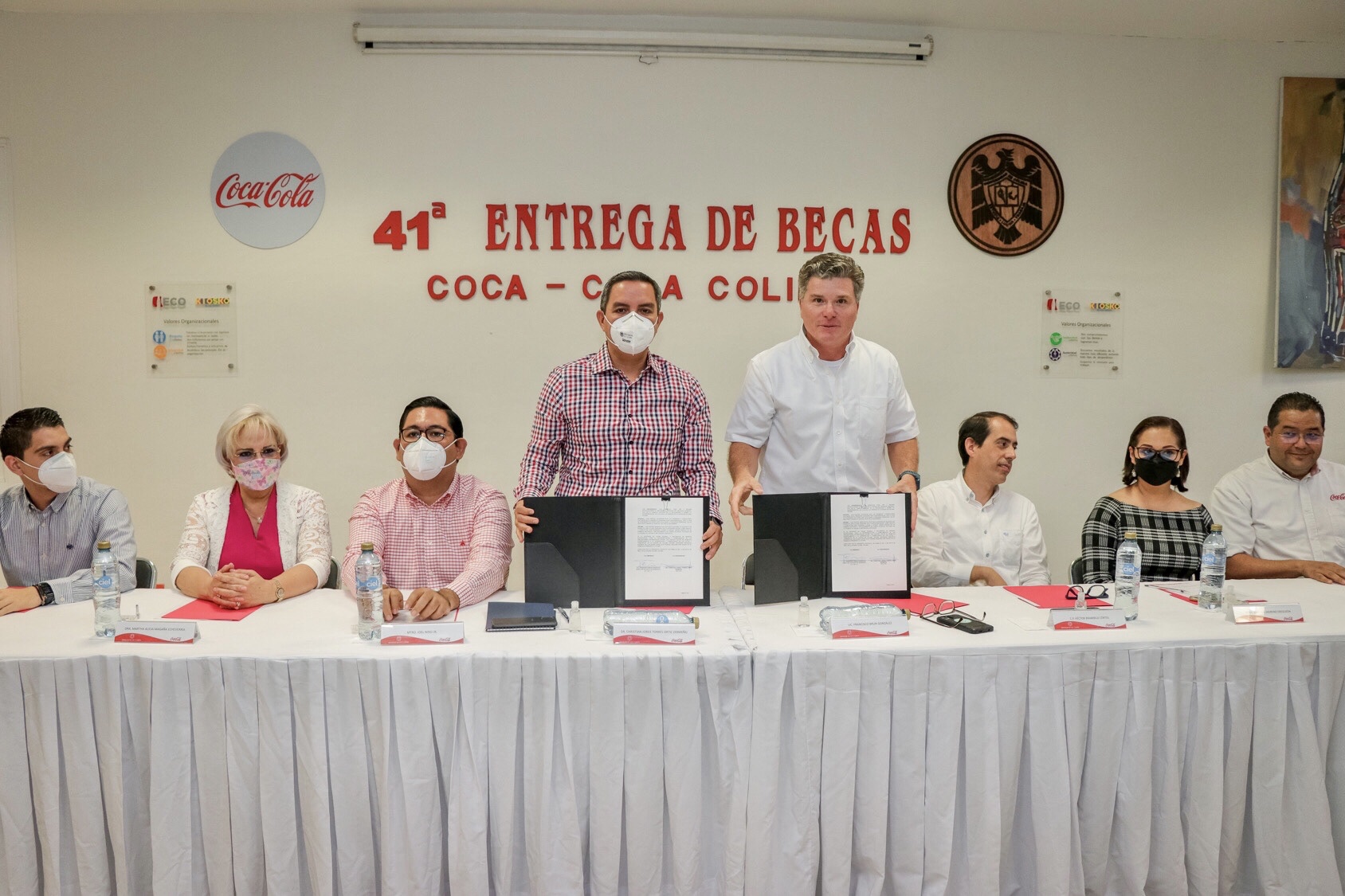 Durante la entrega de 200 becas Coca-Cola a estudiantes de 21 planteles del nivel superior realizada este viernes, la empresa embotelladora, representada por Francisco Brun González y la Universidad de Colima, representada por su rector, Christian Jorge Torres Ortiz Zermeño, firmaron un convenio de colaboración para seguir otorgando este tipo de apoyos a las y los jóvenes que desean continuar sus estudios.