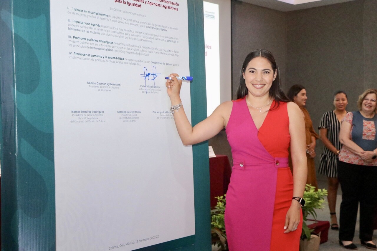 La gobernadora, Indira Vizcaíno Silva y la presidenta del Instituto Nacional de las Mujeres (Inmujeres), Nadine Gasman Zylbermann, firmaron este viernes los compromisos para la igualdad y el bienestar de las mujeres de Colima y presentaron la “Estrategia de acompañamiento para la inducción e implementación de políticas públicas estatales, municipales y agendas legislativas para la igualdad”.