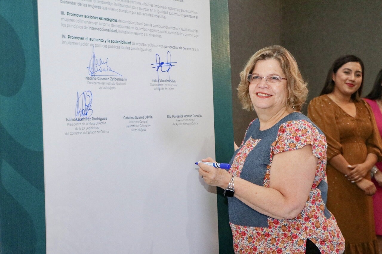 Aseguró que “lo hacemos convencidas de que para consolidar la democracia y la transformación de México, la Cuarta Transformación que estamos viviendo y construyendo todos los días con el liderazgo del presidente López Obrador, es indispensable garantizar el ejercicio pleno de los derechos de las mujeres y por eso el Inmujeres, el Gobierno del Estado de Colima, los ayuntamientos y el Congreso local sumamos esfuerzos en el diseño e implementación de políticas públicas y acciones legislativas que permitan el impulso y posicionamiento de una agenda común para la igualdad sustantiva entre mujeres y hombres”.