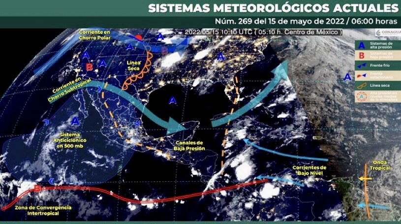 Este día, una línea seca prevalecerá sobre el norte del territorio nacional y se prolongará como un canal de baja presión sobre el noroeste y occidente de México, dicho sistema asociado con la entrada de humedad del Océano Pacífico, favorecerán lluvias y chubascos vespertinos, descargas eléctricas y posible caída de granizo en Chihuahua, Durango, Jalisco, Zacatecas y Michoacán. Un segundo canal de baja presión sobre el sur y sureste del país, propiciará chubascos y descargas eléctricas en dichas regiones, incluida la Península de Yucatán. Adicionalmente, un sistema anticiclónico en niveles medios y altos de la atmósfera, mantendrá el ambiente caluroso a muy caluroso en la mayor parte de la República Mexicana, así como extremadamente caluroso con temperaturas superiores a 45°C en zonas de Chihuahua, Sinaloa y Nayarit.