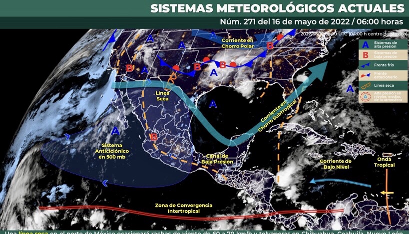 Para hoy, una línea seca permanecerá sobre el norte de México y ocasionará rachas de viento de 60 a 70 km/h y probables tolvaneras en Chihuahua, Coahuila, Nuevo León, Durango y Tamaulipas. Por la tarde, canales de baja presión sobre el interior del país, en interacción con la entrada de humedad proveniente de ambos océanos, producirán chubascos acompañados de descargas eléctricas y posible caída de granizo sobre el norte, occidente, sur y sureste de México, así como en el oriente y occidente de la Península de Yucatán, con lluvias puntuales fuertes en el sur de Chiapas. Finalmente, un sistema anticiclónico en niveles medios de la atmósfera, mantendrá ambiente caluroso a muy caluroso en la mayor parte de la República Mexicana, con temperaturas máximas extremadamente calurosas (superiores a 45°C) en zonas de Sonora, Sinaloa, Chihuahua, Coahuila y Nuevo León.