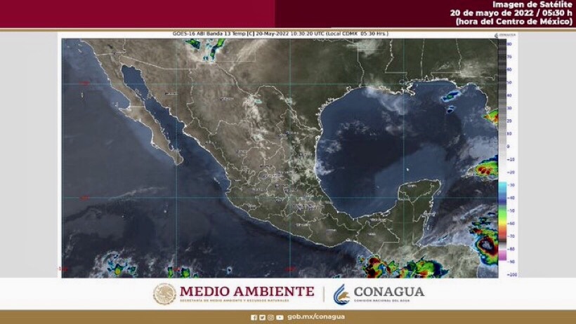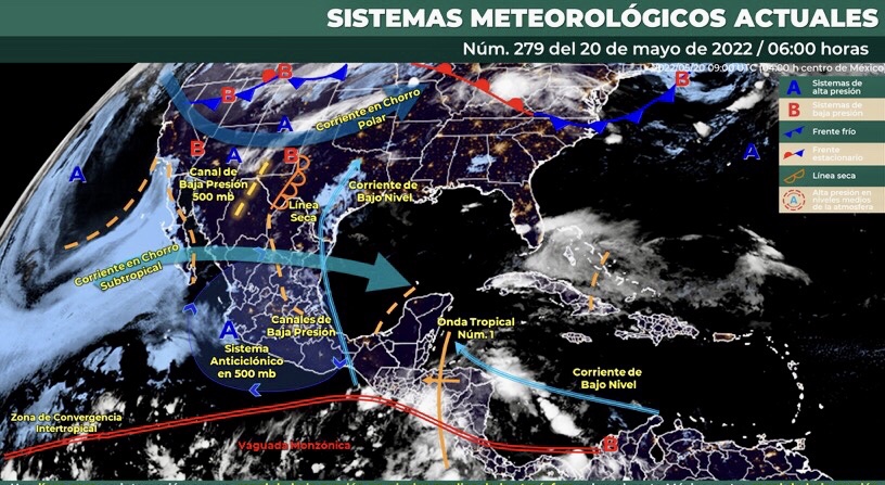 Para hoy, una línea seca en interacción con un canal de baja presión en niveles medios de la atmósfera sobre el norte México y otro canal de baja presión que se extenderá desde el norte hasta el centro del país, en interacción con la entrada de humedad del Golfo de México, originarán lluvias con intervalos de chubascos sobre el noreste, centro y oriente del territorio y lluvias puntuales fuertes con descargas eléctricas y posible caída de granizo en Tamaulipas, Puebla y Tlaxcala. Asimismo, en combinación con la corriente en chorro subtropical, producirán rachas de viento muy fuertes con tolvaneras en Baja California y estados de la Mesa del Norte, además de probabilidad para la formación de torbellinos en Coahuila (noreste), Nuevo León (norte) y Tamaulipas (noroeste). Por su parte, la onda tropical Núm. 1, la cual recorrerá el sur de la Península de Yucatán en interacción con otro canal de baja presión sobre el sureste de México, ocasionarán lluvias con intervalos de chubascos en Oaxaca, Chiapas, Campeche y Yucatán y lluvias puntuales fuertes en Quintana Roo, todas acompañadas de descargas eléctricas, así como rachas de viento fuertes en zonas de Chiapas y de la Península de Yucatán a muy fuertes en el Istmo de Tehuantepec. Finalmente, una circulación anticiclónica en niveles medios de la atmósfera, mantendrá el ambiente vespertino caluroso a muy caluroso en gran parte de la República Mexicana, con temperaturas que pueden superar los 45°C en zonas de Coahuila, Nuevo León, San Luis Potosí y Tamaulipas.