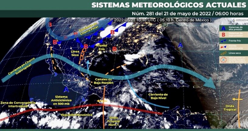 Este día, la onda tropical Núm. 1 recorrerá lentamente el sureste mexicano y generará lluvias puntuales muy fuertes en Chiapas; así como lluvias y chubascos con descargas eléctricas en la región mencionada, así como en la Península de Yucatán. Por otra parte, una línea seca sobre el noreste del país y la aproximación de un nuevo frente frío a la frontera norte y noreste del territorio nacional, originarán chubascos, descargas eléctricas, vientos fuertes y posible caída de granizo en regiones de Coahuila (noreste), Nuevo León (norte) y Tamaulipas (noroeste). Un canal de baja presión se extenderá sobre el noreste y oriente de México e interaccionará con inestabilidad en la atmósfera superior y con la entrada de humedad del Océano Pacífico y Golfo de México, generando chubascos y lluvias fuertes, descargas eléctricas y posibles granizadas en el centro y oriente de la República Mexicana, incluido el Valle de México. Prevalecerá ambiente vespertino caluroso a muy caluroso en gran parte del territorio nacional, con temperaturas que pueden superar los 45°C en zonas de Nuevo León, Tamaulipas, San Luis Potosí y Veracruz.
