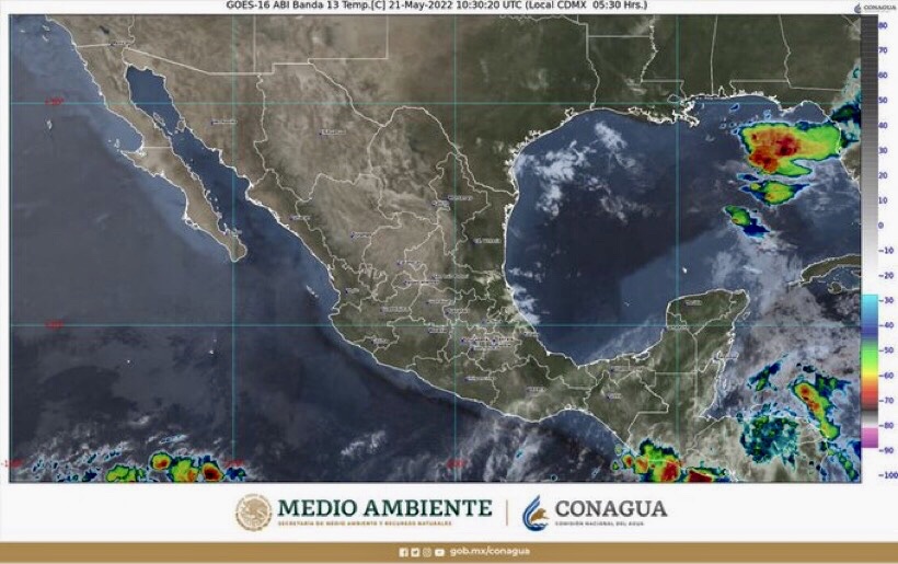 Golfo de México: Cielo parcialmente nublado con ambiente matutino fresco a frío en zonas montañosas de Veracruz. Cielo medio nublado por la tarde con lluvias puntuales fuertes, descargas eléctricas y posible caída de granizo en el noroeste de Tamaulipas, chubascos en Veracruz y lluvias aisladas en Tabasco. Ambiente vespertino muy caluroso y extremadamente caluroso en zonas de Tamaulipas y Veracruz. Viento del sur y sureste de 15 a 30 km/h en la región, con rachas de 60 a 70 km/h en Tamaulipas, y de 50 a 60 km/h en Tabasco y sur de Veracruz.