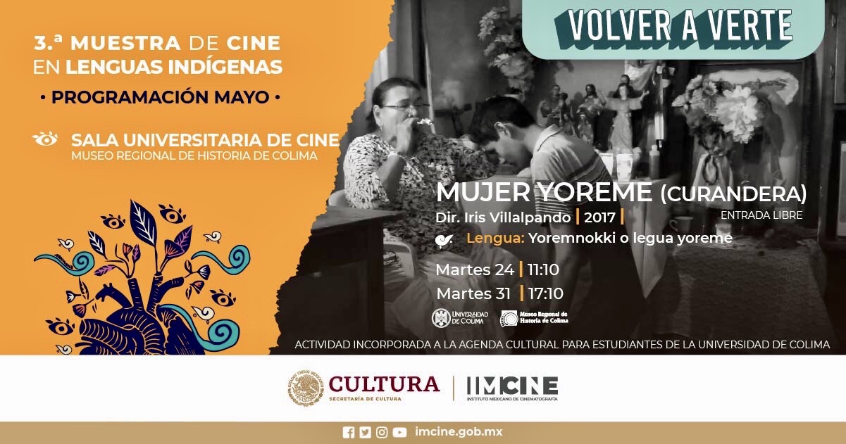 La programación de lo que queda de mayo se desglosa a continuación: “Mujer yoreme (partera)”, que dirigió Iris Villalpando en 2017, hablada en yoremnokki o lengua yoreme, se proyectará en dos funciones, una el martes 24 de mayo a las 11:00 horas y el martes 31 a las 17:00 horas. “Mujer yoreme (curandera)”, también de Iris Villalpando, realizada en 2017 y hablada en lengua yoremnokki o lengua yoreme, se proyectará el martes 24 a las 11:10 horas y el 31 a las 17:10 horas.