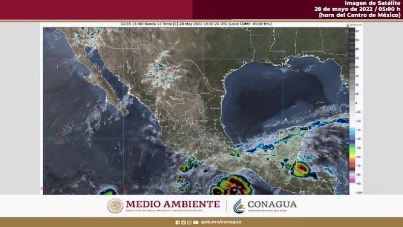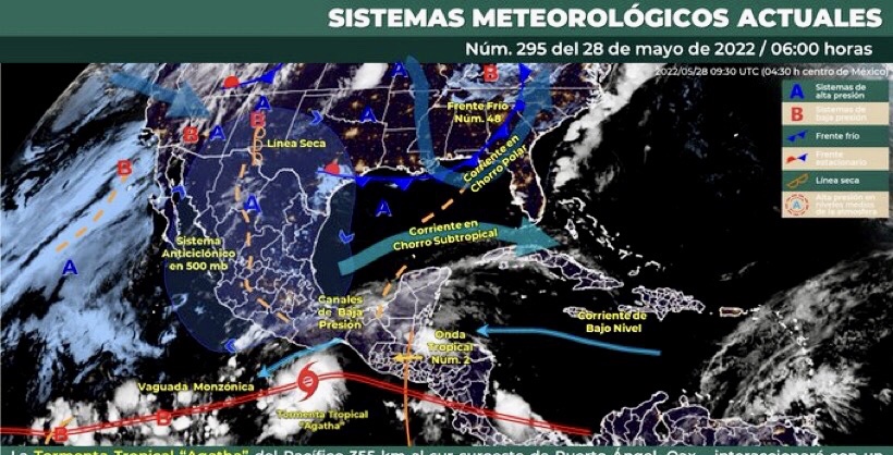 Para hoy, la tormenta tropical “Agatha” del Pacífico, se ubicará al sur de las costas de Oaxaca y Guerrero e interaccionará con un canal de baja presión en el sureste del país y con la onda tropical Núm. 2 que se ubicará al sur de la Península de Yucatán. Dichos sistemas ocasionarán lluvias puntuales fuertes en Quintana Roo, Campeche y Yucatán; muy fuertes en Guerrero y el sur de Veracruz; y lluvias puntuales intensas en zonas de Tabasco, Chiapas y Oaxaca. Es importante mencionar que las lluvias mencionadas podrían generar incremento en los niveles de ríos y arroyos, deslaves e inundaciones en las zonas mencionadas, además de rachas fuertes a muy fuertes de viento y oleaje elevado en costas de Guerrero y Oaxaca. Por otro lado, un canal de baja presiónse extenderá sobre el norte y centro del país y en interacción con una línea seca al norte de México y con inestabilidad en niveles altos de la atmósfera, originarán intervalos de chubascos en el norte y occidente de la República, además de lluvias aisladas y rachas de viento con probabilidad de tolvaneras en el noroeste, norte y noreste de México. Finalmente, una circulación anticiclónica en niveles medios de la atmósfera sobre el norte y occidente de México, mantendrá ambiente vespertino caluroso a muy caluroso en la mayor parte del territorio nacional, y con temperaturas máximas extremadamente calurosas, por arriba de 45°C, en zonas de Sonora y Sinaloa.