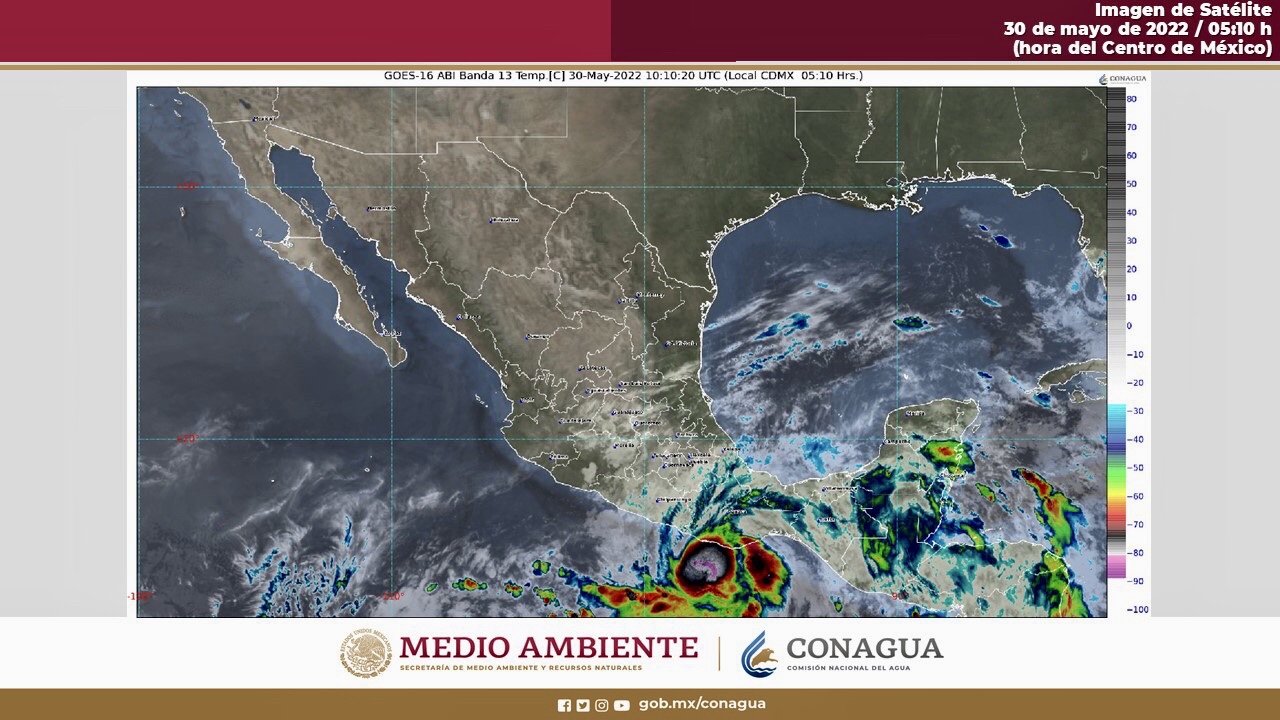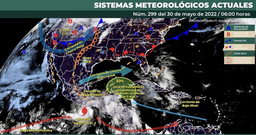 Para hoy, el huracán “Agatha” con categoría 2 (escala Saffir-Simpson), continuará desplazándose hacia las costas de Oaxaca. El centro del ciclón tropical podría tocar tierra en horas de la tarde o noche. Su amplia circulación producirá lluvias extraordinarias en Oaxaca, así como lluvias puntuales muy fuertes a intensas en el sur y sureste del país, incluido el sur de la Península de Yucatán, las cuales podrían generar incremento en los niveles de ríos y arroyos, deslaves e inundaciones. Asimismo, se prevén rachas intensas de viento, de 120 a 150 km/h, con oleaje de 6 a 8 metros en costas de Oaxaca y rachas de 80 a 100 km/h con oleaje de 4 a 6 metros en costas de Guerrero y Chiapas. Por otro lado, un canal de baja presión sobre la Mesa del Norte y Mesa Central, e inestabilidad en niveles altos de la atmósfera, así como la entrada de humedad generada por el ciclón “Agatha” ocasionarán chubascos y lluvias puntuales fuertes que se acompañarán de descargas eléctricas en estados del noreste y centro del país, incluyendo el Valle de México. Finalmente, continuará el ambiente vespertino cálido a caluroso en gran parte del territorio nacional, con temperaturas máximas muy calurosas (por arriba de 40 °C) en zonas de Coahuila, Nuevo León, Tamaulipas y Michoacán.