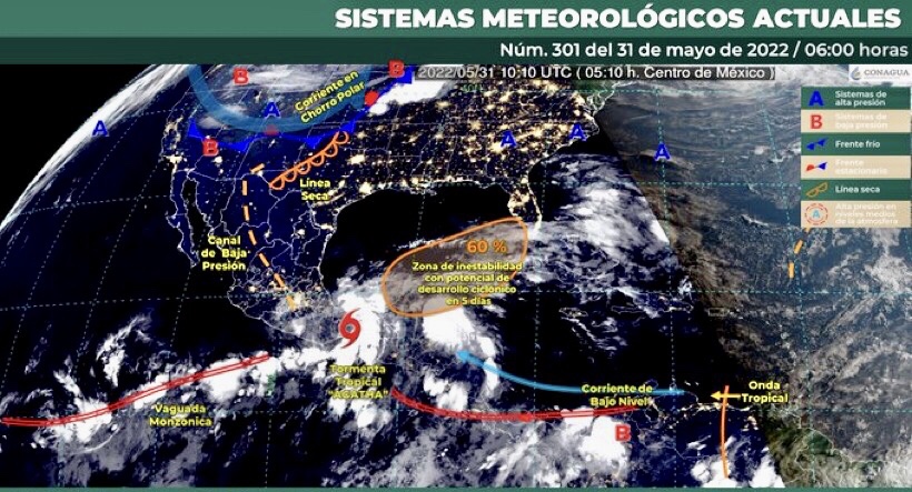 Este día, el centro de “Agatha” se desplazará sobre el sur de Veracruz y mantendrá condiciones para lluvias puntuales torrenciales en Veracruz (sur), Oaxaca (oriente), Chiapas y Tabasco; así como lluvias fuertes a intensas que podrían generar deslaves e inundaciones en el sureste mexicano y en la Península de Yucatán. También, se prevén vientos fuertes con rachas de 50 a 60 km/h y oleaje de 1 a 2 metros de altura significativa en el Golfo de Tehuantepec (costas de Oaxaca y Chiapas, además de Tabasco y sur de Veracruz. Por otra parte, una línea seca, sobre el norte de México, en combinación con un canal de baja presión, sobre la Mesa del Norte y Mesa Central, producirán chubascos, lluvias fuertes y descargas eléctricas en dichas regiones, además de vientos con rachas de 60 a 70 km/h y tolvaneras en Chihuahua, Coahuila, Nuevo León, Tamaulipas, San Luis Potosí, Zacatecas y Durango. Finalmente, se pronostica ambiente cálido a caluroso en gran parte del país, con temperaturas superiores a los 40 °C en Sonora, Chihuahua, Coahuila, Nuevo León y Sinaloa.