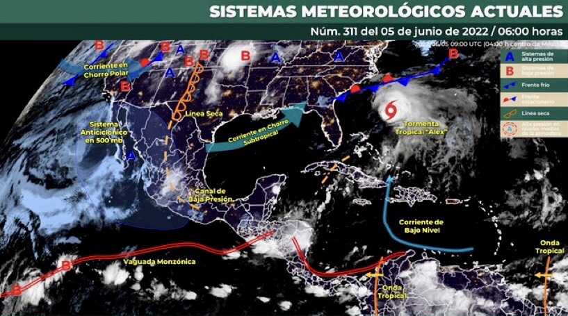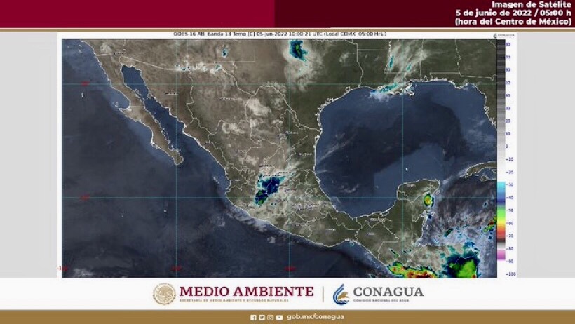 Para hoy, un canal de baja presión se extenderá sobre el norte, centro y sur del país. En interacción con una línea seca sobre Coahuila, inestabilidad en niveles altos de la atmósfera e ingreso de humedad del Océano Pacífico, originarán lluvias puntuales fuertes en Durango, Michoacán, Estado de México, Morelos, Puebla y estados del sur del litoral del Pacífico, así como lluvias con chubascos en Chihuahua Zacatecas y estados del occidente y centro de México; todas acompañadas de descargas eléctricas y con posible caída de granizo en zonas del norte, occidente, centro y sur del país, además de fuertes rachas de viento en los estados de la Mesa del Norte. Por otro lado, el ingreso de humedad del Mar Caribe ocasionará chubascos en el sur de Veracruz y la Península de Yucatán. Asimismo, un sistema anticiclónico en niveles medios de la atmósfera mantendrá el ambiente vespertino cálido a caluroso en gran parte de la República Mexicana, con temperaturas máximas muy calurosas (por arriba de 40 °C), en Baja California, Coahuila, Nuevo León, Tamaulipas, San Luis Potosí y Veracruz.
