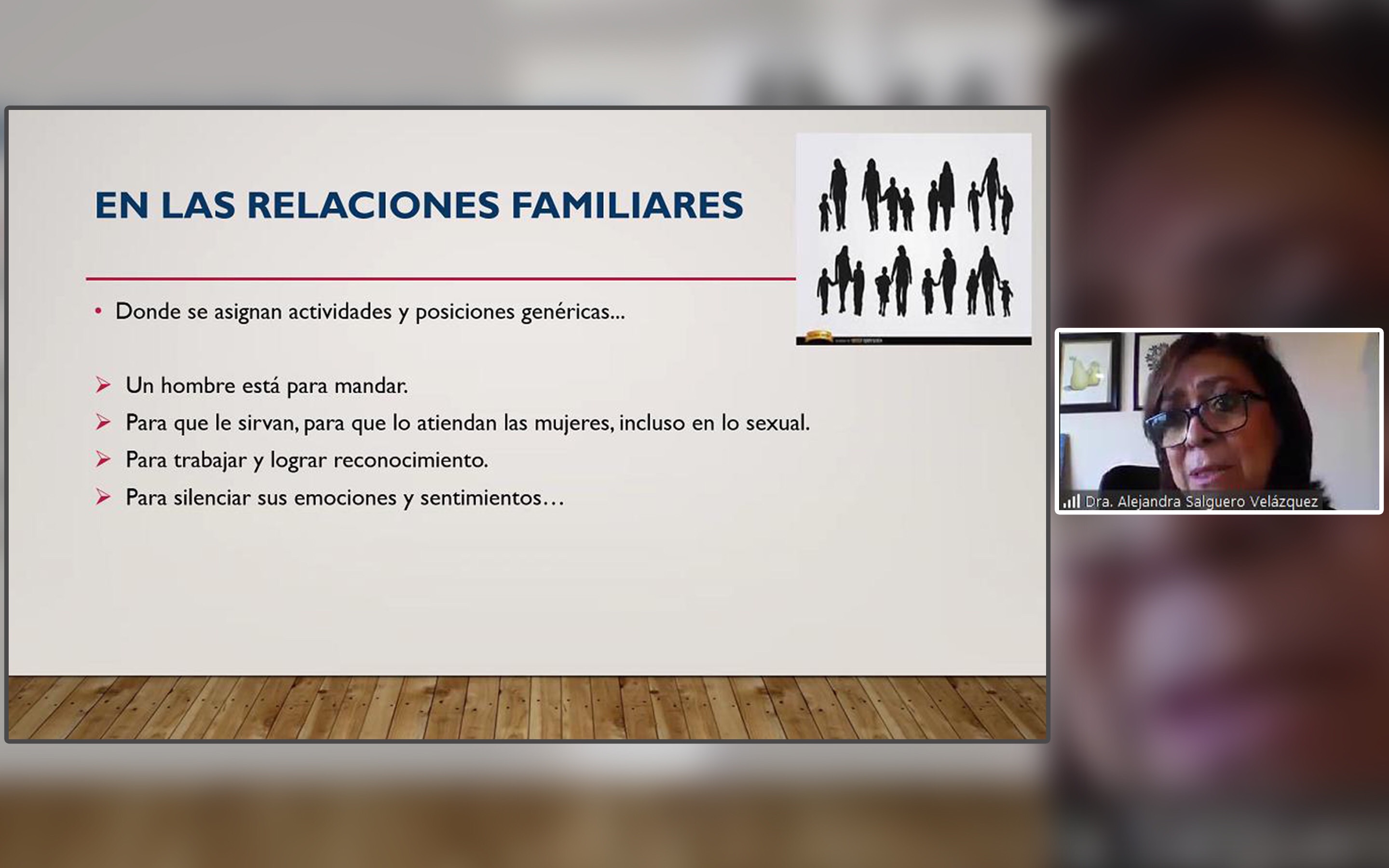 Alejandra Salguero indicó que, de acuerdo con sus investigaciones y premisas teóricas, “es en las relaciones familiares donde se asignan actividades y posiciones genéricas; el hombre está para mandar, para que le sirvan, lo atiendan las mujeres (incluso en lo sexual), para trabajar, lograr reconocimiento y silenciar emociones y sentimientos”.