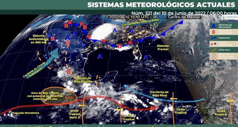 Este día, la onda tropical Núm. 3 se desplazará al sur y occidente del territorio nacional y, en combinación con el ingreso de humedad del Océano Pacífico generado por la vaguada monzónica, que se extenderá frente a las costas de Oaxaca y Chiapas, mantendrá un temporal de lluvias fuertes a muy fuertes en Veracruz, Guerrero, Oaxaca y Chiapas; además, en interacción con un canal de baja presión, que se extenderá sobre el norte, occidente y centro de México, con inestabilidad en niveles altos de la atmósfera y con el ingreso de humedad del Océano Pacífico y Golfo de México, ocasionará chubascos y lluvias fuertes, descargas eléctricas y posible caída de granizo en dichas regiones, incluido el Valle de México. También se pronostican fuertes rachas de viento con tolvaneras en zonas del norte y noreste del país. Por otra parte, continuará el ambiente vespertino caluroso a muy caluroso en gran parte del país con temperaturas por arriba de 35°C en 20 estados, pudiendo superar los 45°C en Baja California y Sonora. Finalmente, se espera que, una nueva onda tropical se aproxime al sureste de México, reforzando el potencial de lluvias.