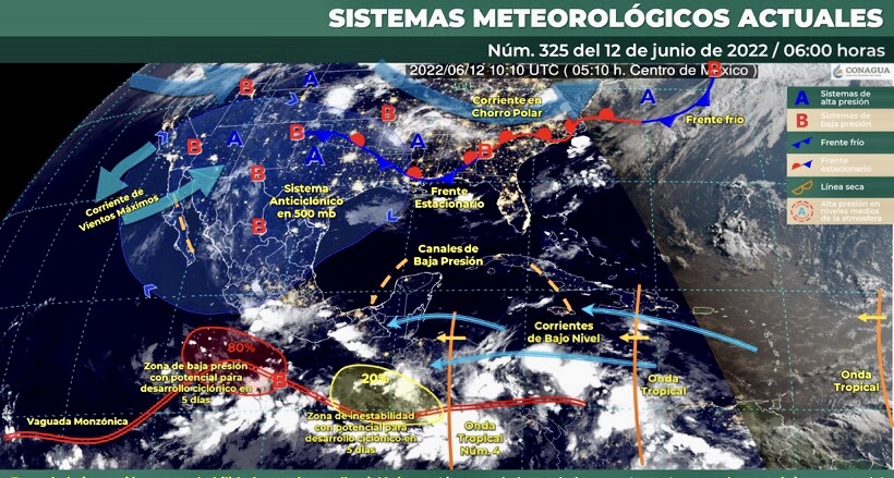 Este día, la zona de baja presión con probabilidad para desarrollo ciclónico, continuará intensificándose y en combinación con el ingreso de humedad generado por la vaguada monzónica mantendrá lluvias fuertes a muy fuertes en Jalisco, Colima, Guerrero y Oaxaca, las cuales podrían generar incremento en los niveles de ríos y arroyos, deslaves e inundaciones. Canales de baja presión prevalecerán sobre el norte, noreste, occidente, centro y sureste de México y, en interacción con inestabilidad atmosférica superior y con el ingreso de humedad del Océano Pacífico, Golfo de México y Mar Caribe, generarán chubascos vespertinos y lluvias fuertes con puntuales muy fuertes y descargas eléctricas sobre las regiones mencionadas, incluidos el Valle de México y la Península de Yucatán, además de posible caída de granizo en zonas del norte, occidente y centro del país. A su vez, se pronostican vientos fuertes con rachas de 60 a 70 km/h y tolvaneras sobre entidades del norte y noreste del territorio nacional. Onda tropical Núm. 4 se aproximará al sureste de Chiapas y reforzará las lluvias en dicha entidad; sin embargo, en el transcurso del día será absorbida por la circulación de una zona de baja presión, ubicada al sur de las costas de El Salvador. Finalmente, una circulación anticiclónica en niveles medios de la atmósfera mantendrá el ambiente vespertino cálido a caluroso en gran parte del territorio mexicano con temperaturas por arriba de 45°C en Baja California.