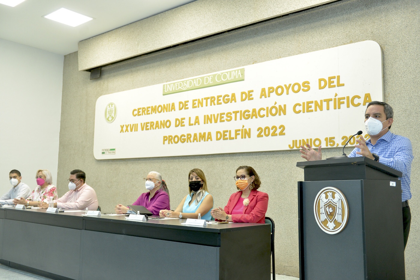 Este miércoles, el rector de la Universidad de Colima, Dr. Christian Jorge Torres Ortiz Zermeño entregó becas a 63 estudiantes que asistirán de manera presencial y en algunos casos virtual, al Verano de Investigación Científica del Programa Delfín 2022, en su edición 27, en más de cien instituciones y centros de investigación del país y de Colombia. La Universidad de Colima, a su vez, recibirá a 132 estudiantes que realizarán su estancia de investigación.
