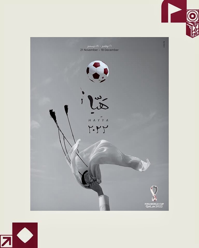 “Quería que cada cartel mostrara la celebración y la afición al futbol en Qatar. El póster principal muestra la ‘gutra‘ y el ‘egal‘ (tocado tradicional) agitándose en el aire en señal de celebración, algo que los aficionados hacen aquí cuando se marca un gol”, apuntó.