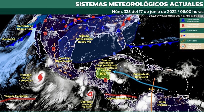 Para hoy, el ciclón tropical “Blas” se desplazará hacia el oeste-noroeste, alejándose paulatinamente de costas nacionales. No obstante, sus bandas nubosas aportarán humedad y mantendrán la probabilidad de lluvias puntuales fuertes a muy fuertes en Guerrero y los estados del centro y norte del litoral del Pacífico Mexicano. Un canal de baja presión extendido sobre la Mesa del Norte y la Mesa Central, favorecerá el ingreso de aire húmedo en el interior del país, con chubascos y lluvias puntuales fuertes en el norte, noreste y centro de México, así como lluvias puntuales muy fuertes en Veracruz y Oaxaca. Las bandas nubosas de la Depresión Tropical “Tres-E” ubicada al sureste de Chiapas, producirán lluvias puntuales muy fuertes en el occidente de la Península de Yucatán e intensas en el sureste del país, las cuales podrían generar deslaves e inundaciones en zonas de Campeche, Yucatán, Tabasco y Chiapas. Por otra parte, una zona de baja presión con probabilidad para desarrollo ciclónico en el occidente del Mar Caribe, producirá lluvias puntuales intensas que podrían generar inundaciones en zonas de Quintana Roo. Finalmente, una circulación anticiclónica en niveles medios de la atmósfera mantendrá el ambiente vespertino caluroso a muy caluroso sobre entidades del noroeste, noreste y sureste del territorio nacional, con temperaturas máximas extremadamente calurosas, superiores a 45°C, en zonas de Baja California, Sonora y Sinaloa.