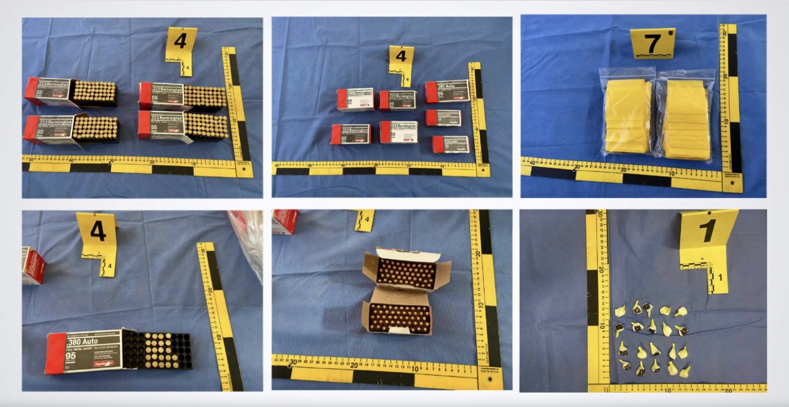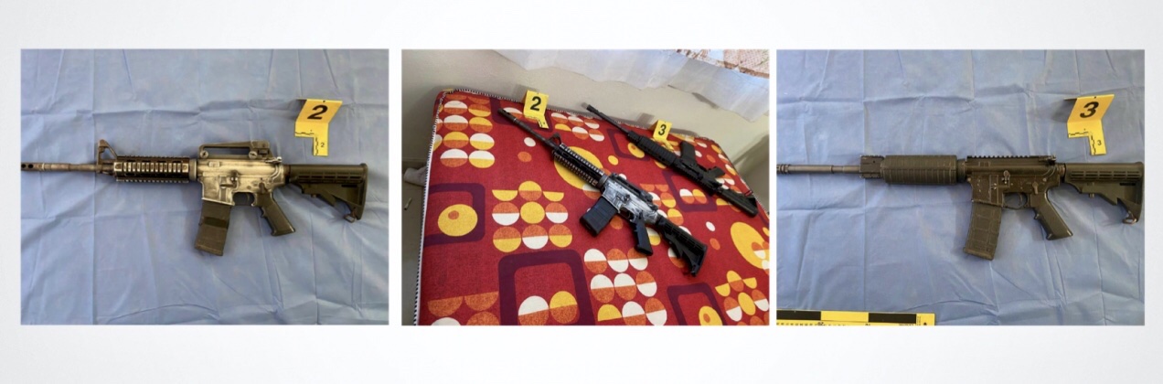 También se localizó un arma de fuego larga de la marca Bush Master modelo XM15-E25 con matrícula BFI419590, así como un arma de fuego larga con la leyenda “Zombi” modelo SL15, matrícula SAR48712. Igualmente se localizaron siete cajas de cartón, de las cuales cuatro contenían 50 cartuchos, cada uno de calibre .223 Rem; dos cajas con 50 cartuchos, cada uno de calibre 9 milímetros Luger y una caja con 22 cartuchos del calibre .380 automática.