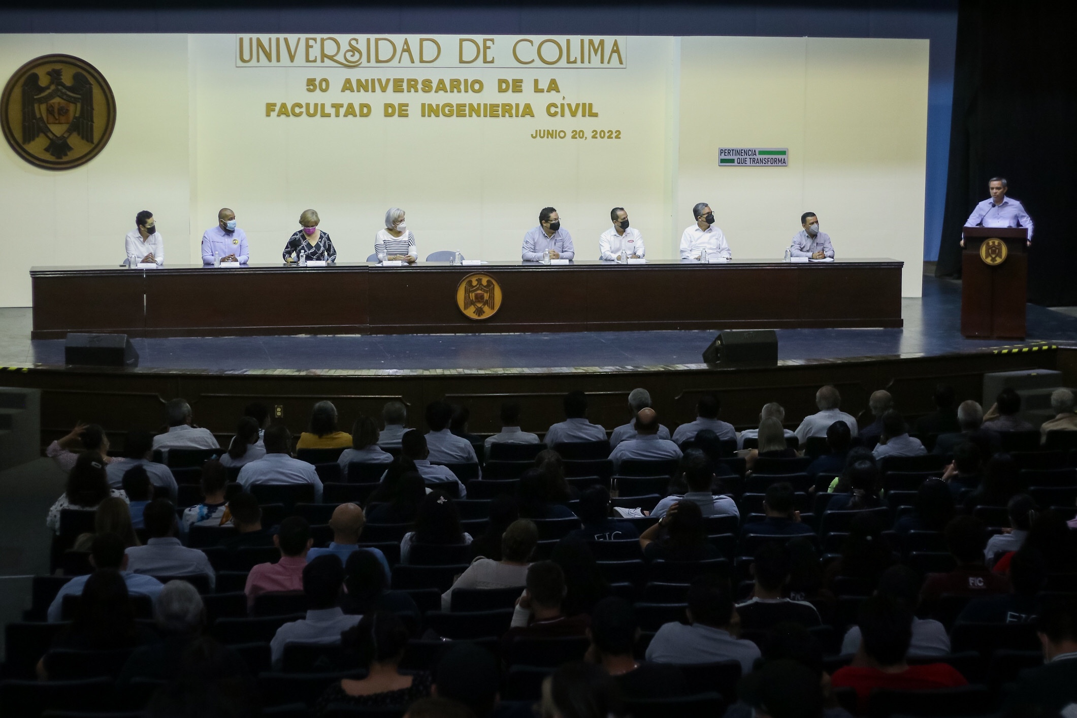 Con actividades académicas, musicales y el reconocimiento a quienes han sido sus directores, este lunes la Universidad de Colima celebró el 50 aniversario de la Facultad de Ingeniería Civil (FIC), en el Paraninfo Universitario, acto durante el cual el rector Christian Jorge Torres Ortiz Zermeño dijo que este plantel, a lo largo cinco décadas, “ha contribuido en la formación de profesionistas que se han integrado al sector productivo de nuestro país con responsabilidad y ética para la seguridad humana, para el beneficio social y el desarrollo equitativo a través de la innovación científica y tecnológica”.
