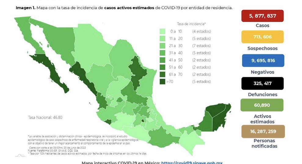 La Secretaría de Salud informó este lunes que México suma 5 millones 877 mil 837 casos y 325 mil 417 muertes por COVID-19.