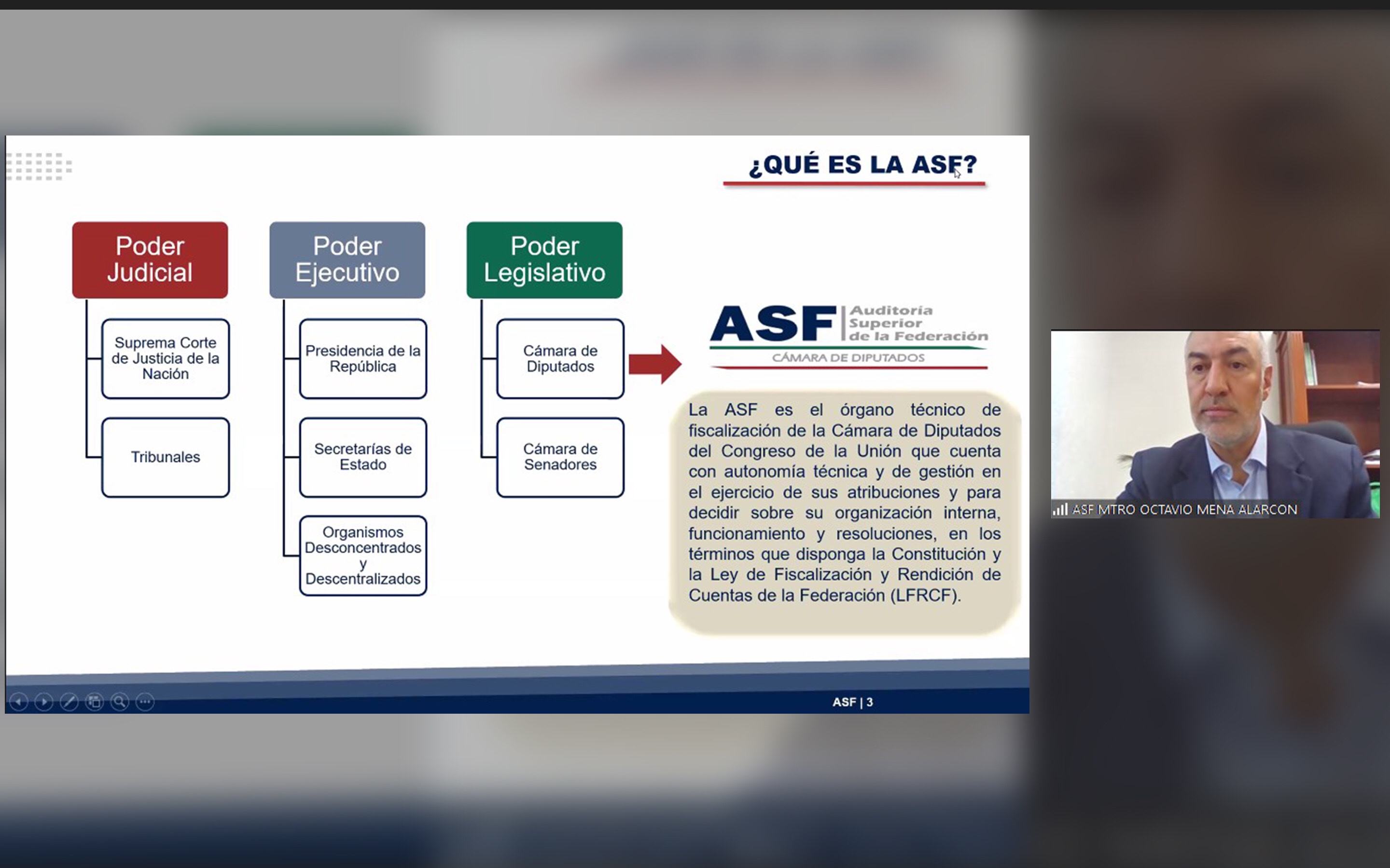 Posteriormente, Octavio Mena Alarcón, director general de auditoría a los recursos federales transferidos “B” de la Auditoría Superior de la Federación (ASF) presentó la conferencia “Reglas para el ejercicio del programa U006 para universidades públicas estatales y su fiscalización”, en la que recordó que la ASF es un órgano técnico de fiscalización de la Cámara de Diputados del Congreso de la Unión.