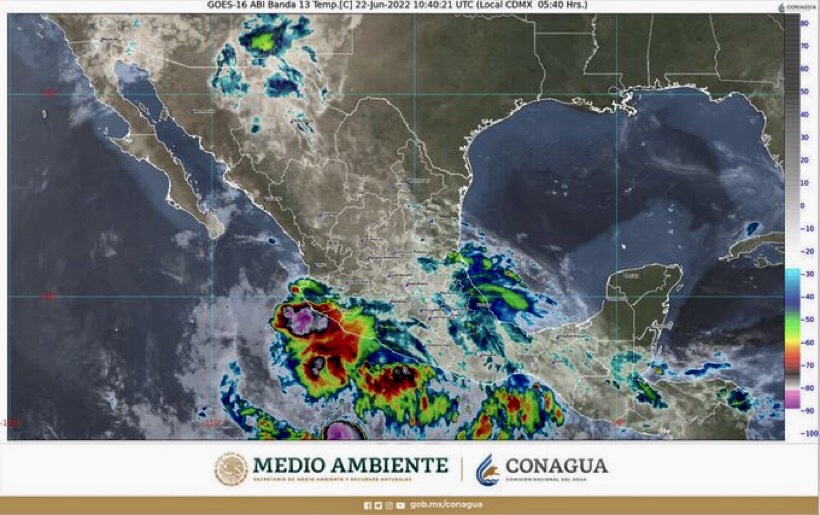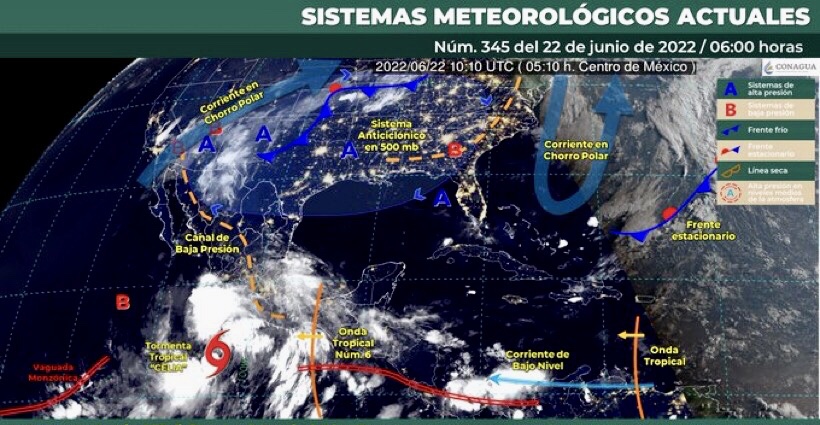 Este día, la tormenta tropical “Celia” se desplazará al sur de las costas de Michoacán, continuará interactuando con la onda tropical Núm. 6, que recorrerá el sur del territorio nacional y mantendrá el temporal de lluvias puntuales torrenciales en zonas de Guerrero, así como lluvias puntuales intensas, que podrían originar incremento en los niveles de ríos y arroyos, inundaciones y deslaves, en zonas de Michoacán, Oaxaca, Puebla y Veracruz; además de lluvias fuertes a muy fuertes y descargas eléctricas sobre entidades del sureste, oriente, centro y sur del país, incluido el Valle de México. Asimismo, un canal de baja presión a largo de la Sierra Madre Occidental, en interacción con inestabilidad en niveles altos de la atmósfera y con el ingreso de humedad del Océano Pacífico, originarán chubascos vespertinos con lluvias puntuales fuertes y descargas eléctricas en el noroeste y occidente de México, con posibles granizadas en Sonora y Chihuahua. Por otra parte, una circulación anticiclónica en niveles medios de la atmósfera, sobre el sur de Estados Unidos, mantendrá el ambiente vespertino caluroso a muy caluroso sobre entidades del noroeste, norte y noreste de la República Mexicana, con temperaturas superiores a 40°C en Baja California, Sonora, Sinaloa, Coahuila, Nuevo León y Tamaulipas.