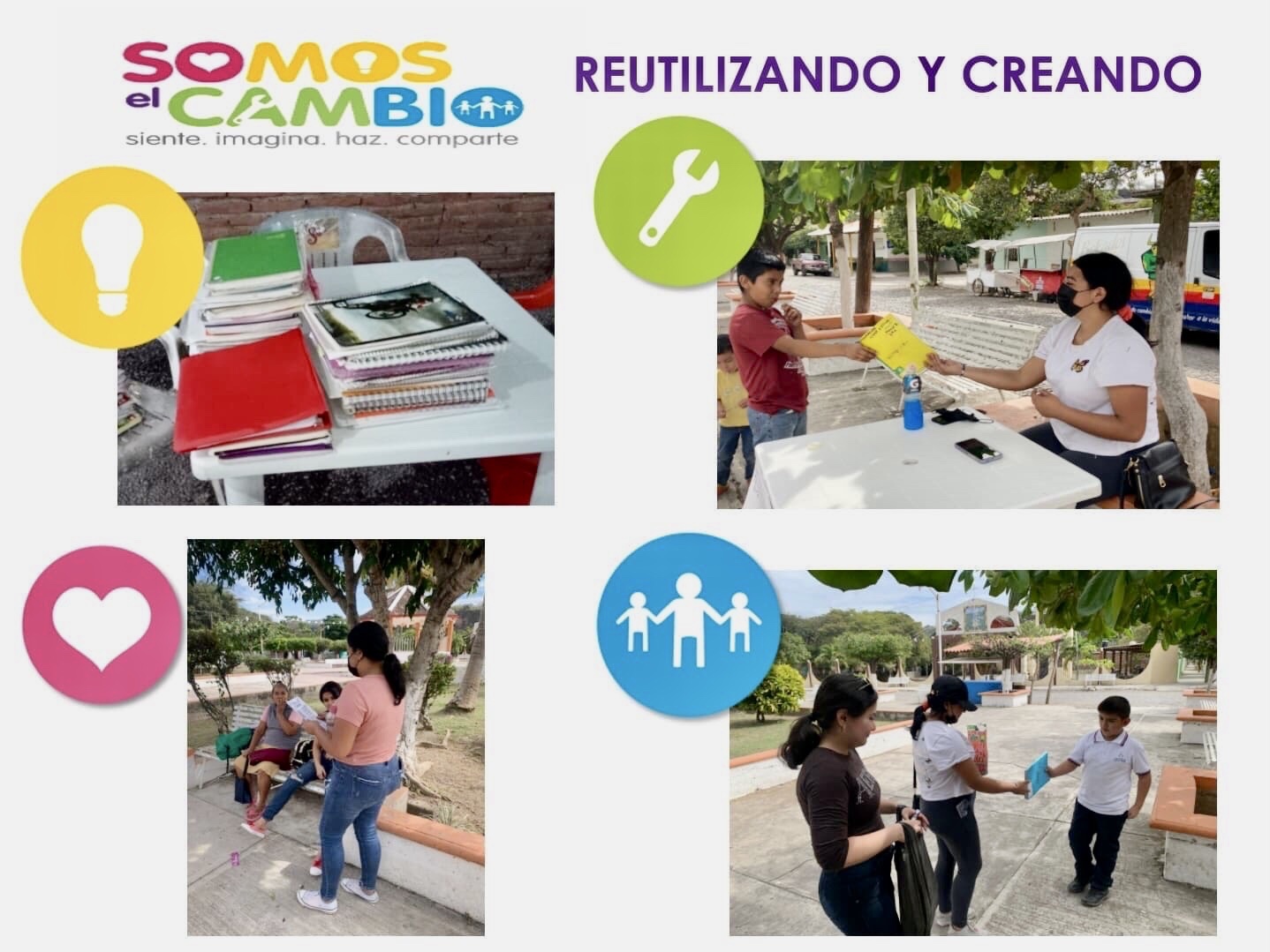 Estudiantes del Bachillerato 17 de la Universidad de Colima, ubicado en Comala, participaron en la convocatoria 2022 de la Fundación Somos el Cambio, con un proyecto para reutilizar las hojas limpias de los cuadernos usados y elaborar libretas, que distribuyeron entre las niñas y los niños de escasos recursos de dicho municipio.