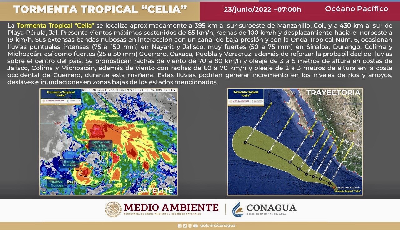 Esta mañana la #TormentaTropical #Celia se localizó aproximadamente a 395 km al sur-suroeste de Manzanillo, #Colima y a 430 km al sur de Playa Pérula, #Jalisco. Más información en ⬇️
