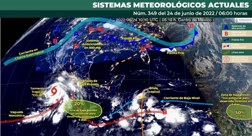 Este día, la amplia circulación de “Celia”mantendrá cielo nublado con lluvias de muy fuertes a puntuales intensas, descargas eléctricas y rachas de viento en zonas del occidente de México, así como oleaje elevado en costas de dicha región. Asimismo, un canal de baja presión se extenderá sobre el noroeste, occidente, centro y sur del territorio mexicano y, en interacción con la entrada de humedad generada por “Celia” y con inestabilidad en niveles altos de la atmósfera, originarán lluvias puntuales muy fuertes en zonas de Sinaloa, además de chubascos y lluvias puntuales fuertes, descargas eléctricas y posible caída de granizo en las regiones mencionadas. Un segundo canal de baja presión en el sureste mexicano, asociado con la entrada de humedad del Golfo de México y Mar Caribe, generarán chubascos y lluvias puntuales fuertes en dicha región, incluida la Península de Yucatán. Para la madrugada del sábado, una nueva onda tropical se aproximará a la Península de Yucatán, reforzando el potencial de lluvias en dicha Península. Por otra parte, continuará el ambiente vespertino caluroso a muy caluroso sobre entidades del noroeste, norte y noreste de la República Mexicana con temperaturas superiores a 40°C en Baja California, Baja California Sur, Sonora y Sinaloa.