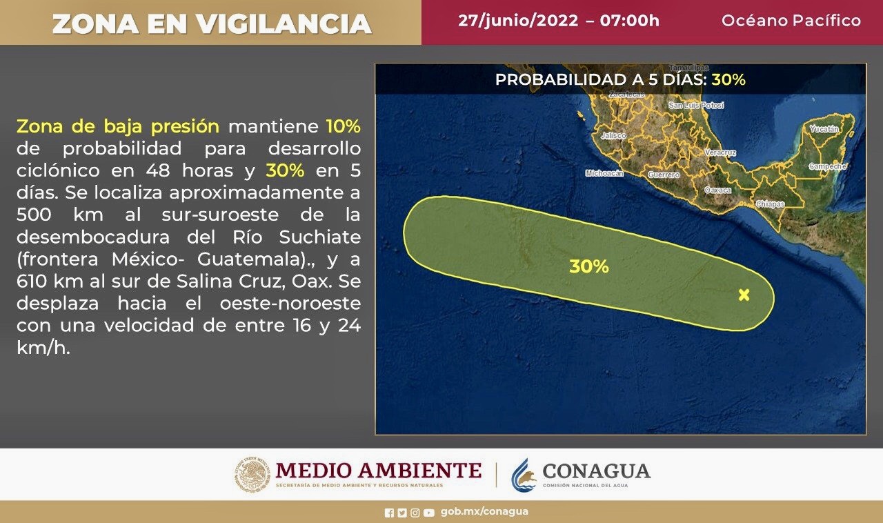 El #SMNmx mantiene en vigilancia una zona de #BajaPresión localizada en el océano #Pacífico, con 10 % de probabilidad de desarrollo ciclónico en 48 horas y 30 % en cinco días.