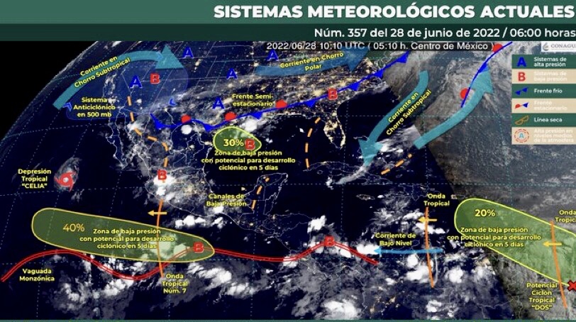 Este día, un frente semiestacionario cercano a la frontera noreste de México, interaccionará con una zona de baja presión con probabilidad de desarrollo ciclónico, ubicada al noreste de Tamaulipas y ocasionará lluvias puntuales fuertes, tormentas eléctricas y posibles granizadas en Coahuila, Nuevo León y Tamaulipas. Así mismo, un canal de baja presión extendido a lo largo de la Sierra Madre Occidental, interaccionará gradualmente con la onda tropical Núm. 7 sobre el occidente mexicano, ambos sistemas producirán lluvias puntuales muy fuertes, descargas eléctricas y posible caída de granizo en regiones de Durango, Sinaloa, Nayarit, Jalisco, Michoacán y Guerrero. Otro canal de baja presión en combinación con la entrada de humedad del Golfo de México y Mar Caribe, propiciará chubascos y lluvias fuertes en el centro y sureste del país, incluida la Península de Yucatán. Por otra parte, prevalecerá ambiente vespertino caluroso a muy caluroso sobre entidades del noroeste, norte y noreste del territorio nacional, con temperaturas máximas superiores a 40°C en zonas de Baja California, Sonora y Sinaloa.