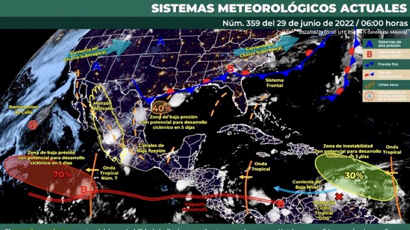 Este día, el monzón mexicano mantendrá la probabilidad de lluvias puntuales muy fuertes acompañadas de descargas eléctricas y posibles granizadas en Sonora, Durango y Sinaloa, así como fuertes en regiones de Chihuahua y Zacatecas. Por otro lado, una zona de baja presión con probabilidad de desarrollo ciclónico se ubicará al noreste de Tamaulipas y favorecerá la probabilidad de lluvias puntuales fuertes en Coahuila, Nuevo León, Tamaulipas y San Luis Potosí. Canales de baja presión sobre el occidente, centro y sureste del país, en interacción con inestabilidad en niveles altos de la atmósfera y la entrada de humedad proveniente del Océano Pacífico, Golfo de México y Mar Caribe, ocasionarán chubascos y lluvias muy fuertes en dichas regiones, incluido el Valle de México y la Península de Yucatán, pronosticándose lluvias puntuales muy fuertes, tormentas eléctricas y posible caída de granizo en Nayarit y Jalisco. Finalmente, se pronostica ambiente caluroso a muy caluroso en entidades del noroeste, norte y noreste de la República Mexicana, con temperaturas máximas superiores a 40°C en el noreste de Baja California, noroeste de Sonora y norte de Sinaloa.