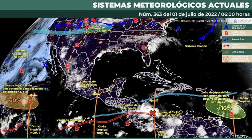 Para este día, el monzón mexicano mantendrá las condiciones para lluvias fuertes en el noroeste de la República Mexicana, pronosticándose lluvias puntuales muy fuertes, descargas eléctricas y posibles granizadas en Sonora, Chihuahua y Durango. Un canal de baja presión sobre el occidente y centro del país, en combinación con la onda tropical Núm. 8 que recorrerá el sur del país, ocasionarán lluvias fuertes con tormentas eléctricas en dichas regiones, previéndose lluvias puntuales muy fuertes en Guerrero. Otro canal de baja presión en la Península de Yucatán y la entrada de humedad del Mar Caribe ocasionarán, en horas de la tarde, lluvias fuertes en Campeche, Yucatán y Quintana Roo. Finalmente, continuará el ambiente vespertino caluroso a muy caluroso sobre entidades del noroeste, norte y noreste de México, con temperaturas máximas cercanas a 45 °C en zonas de Baja California, Sonora y Sinaloa.
