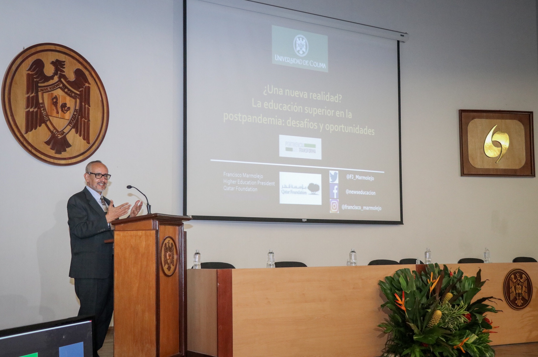 El recién nombrado Doctor Honoris Causa por la Universidad de Colima, Francisco Javier Marmolejo Cervantes, dictó este jueves la conferencia “¿Una nueva realidad? La Educación Superior en la Postpandemia: Desafíos y Oportunidades”, en el auditorio de la Facultad de Ciencias Políticas y Sociales, ante estudiantes, docentes y directivos de esta casa de estudios.