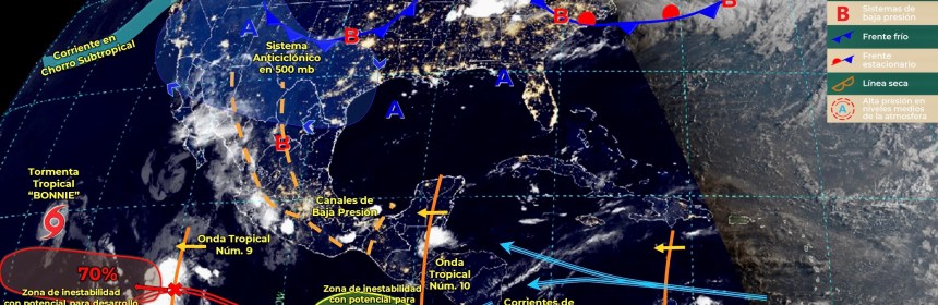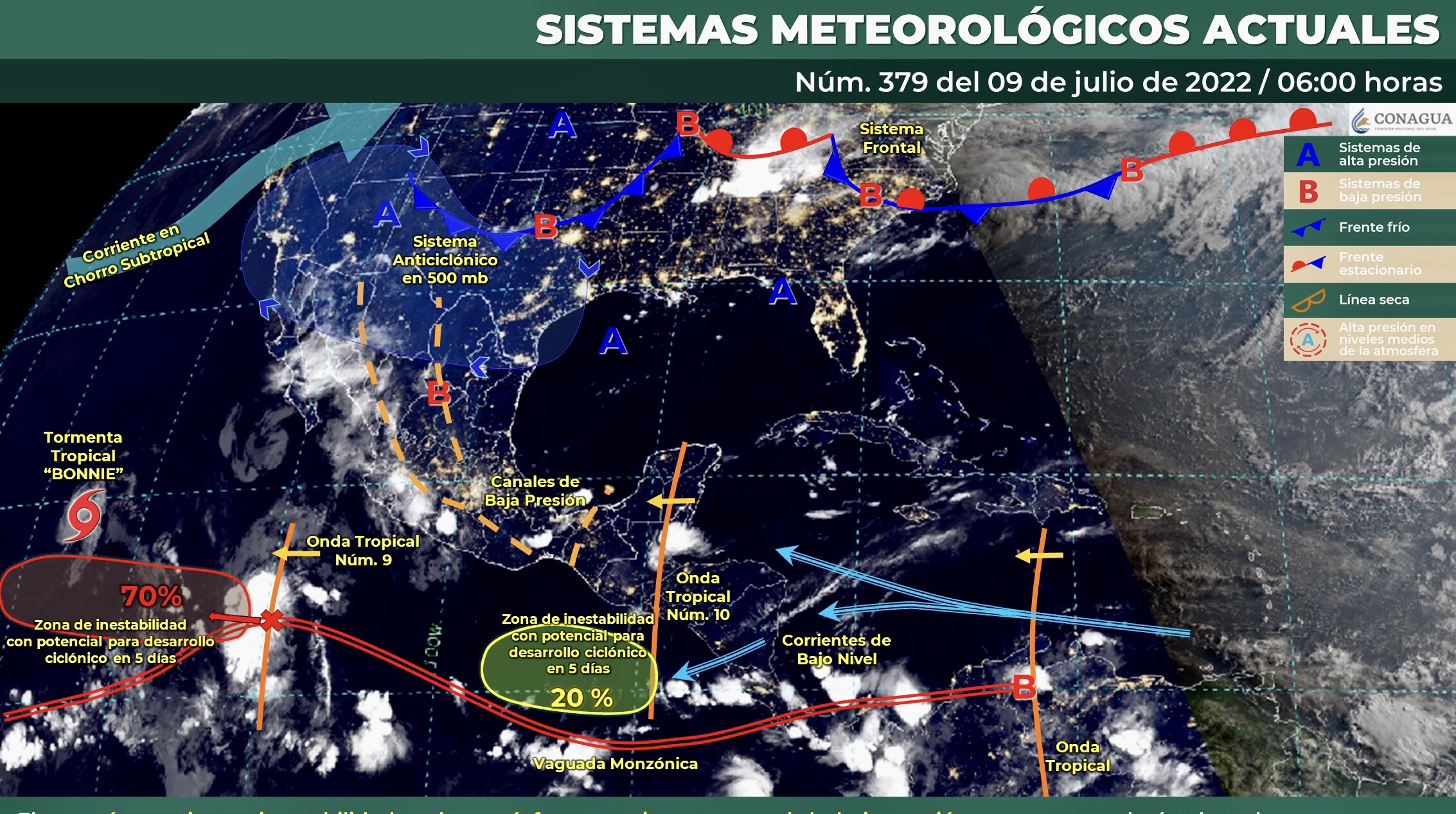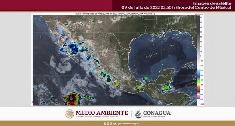 Para este día, el monzón mexicano, inestabilidad en la atmósfera superior y un canal de baja presión que se extenderá sobre el noroeste, norte, occidente, centro y sur del territorio nacional, mantendrán las condiciones para chubascos y lluvias fuertes, descargas eléctricas y posibles granizadas en dichas regiones, incluido el Valle de México, con lluvias puntuales muy fuertes en Jalisco, Colima, Michoacán y Guerrero. La nueva onda tropical Núm. 10 recorrerá la Península de Yucatán y el sureste mexicano e interaccionará con un canal de baja presión, incrementando la probabilidad de lluvias puntuales muy fuertes en Veracruz (sur), Oaxaca, Chiapas, Tabasco y Campeche. Finalmente, prevalecerá el ambiente vespertino caluroso a muy caluroso sobre el noroeste, norte y noreste de México, con temperaturas máximas superiores a 40°C en Baja California, Sonora, Chihuahua, Sinaloa, Coahuila, Nuevo León y Tamaulipas.