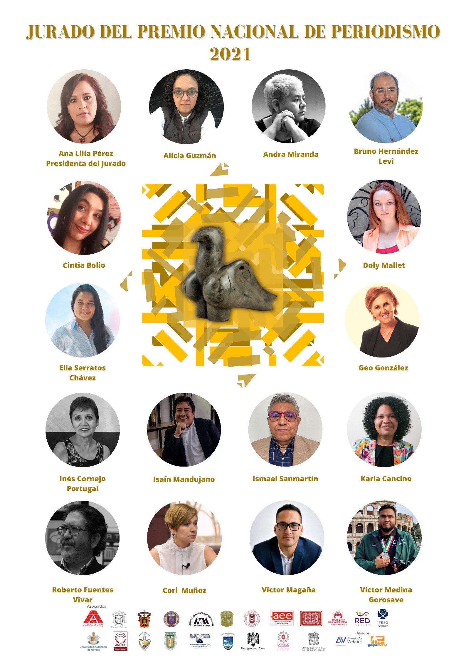 Las y los integrantes del jurado son: Alicia Guzmán, directora editorial, periodista digital y académica; Ana Lilia Pérez, periodista, escritora, analista, profesora de periodismo en la UNAM; Andrea Miranda, editora general de El Debate y el debate.com.mx; Bruno Hernández Levi, coordinador de Radio de la Universidad Autónoma del Estado de Morelos; Cintia Bolio, monera escribiente, pionera en la caricatura política y cómic de alto contenido feminista y crítico; Doly Mallet, periodista, escritora y crítica de cine y Elia Serratos Chávez, docente y exerta en periodismo institucional y digital.