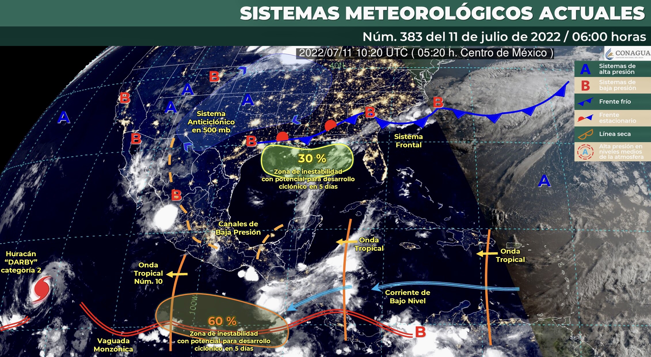 Para este día, el monzón mexicano e inestabilidad en niveles altos de la atmósfera ocasionarán lluvias puntuales muy fuertes con posibles granizadas en regiones de Sonora, Chihuahua, Sinaloa y Durango. La onda tropical Núm. 10 se desplazará al sur de las costas de Jalisco e interaccionará con un canal de baja presión que se extenderá desde el occidente hasta el centro del país, generando lluvias fuertes a muy fuertes acompañadas de descargas eléctricas y posibles granizadas en las regiones mencionadas, incluido el Valle de México. Por otra parte, una nueva onda tropical se aproximará al oriente de la Península de Yucatán e interaccionará gradualmente con un canal de baja presión sobre la Sonda de Campeche, incrementando la probabilidad de chubascos y lluvias fuertes con descargas eléctricas en dicha península y en el sureste mexicano, con lluvias puntuales muy fuertes en Chiapas. Finalmente, prevalecerá el ambiente vespertino muy caluroso sobre entidades del noroeste, norte y noreste de México, con temperaturas máximas que podrían superar los 45°C en Baja California y Sonora.